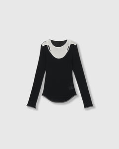 レイヤードデザインが特徴のトップス。程よく上品な透け感があり、春のコーディネートに軽やかさをプラスします。