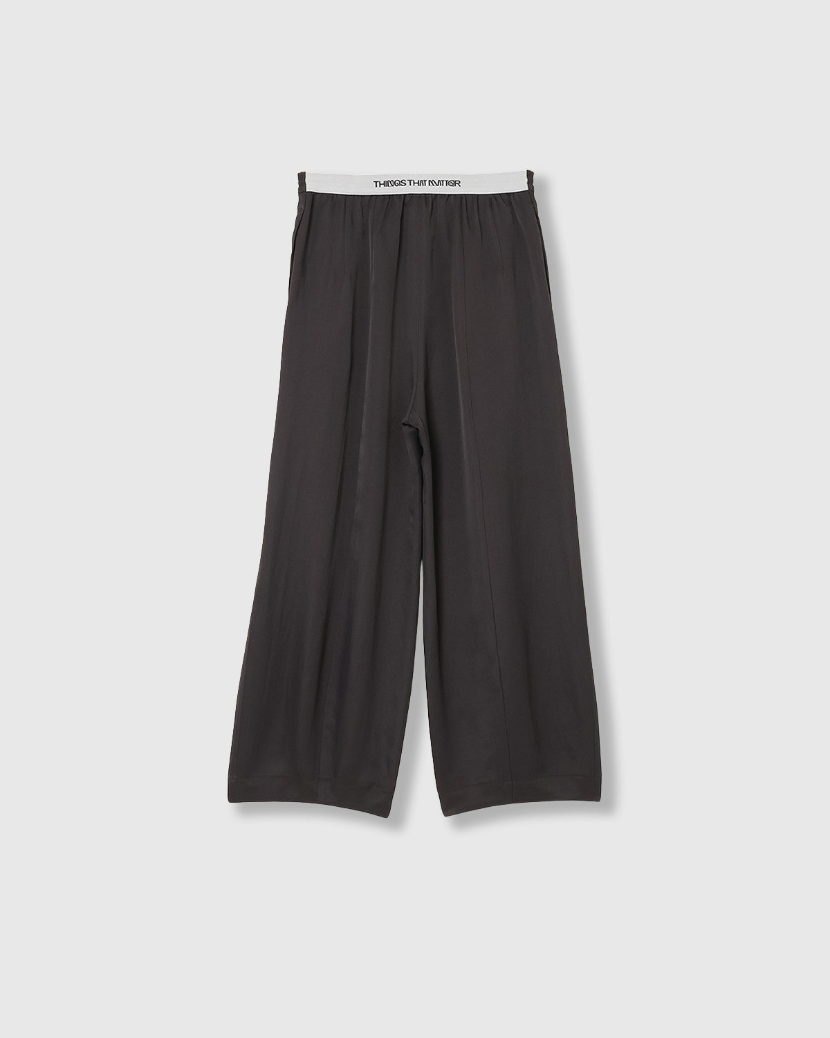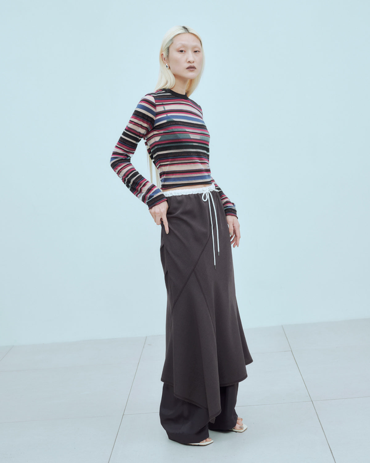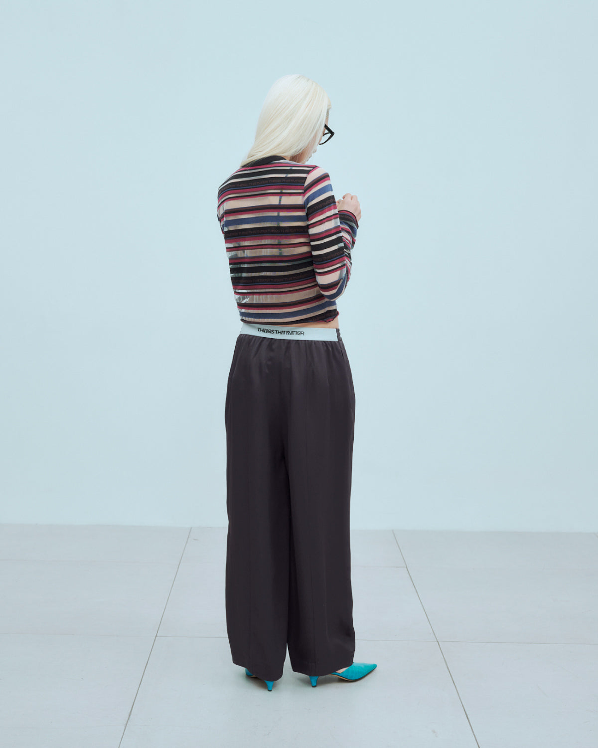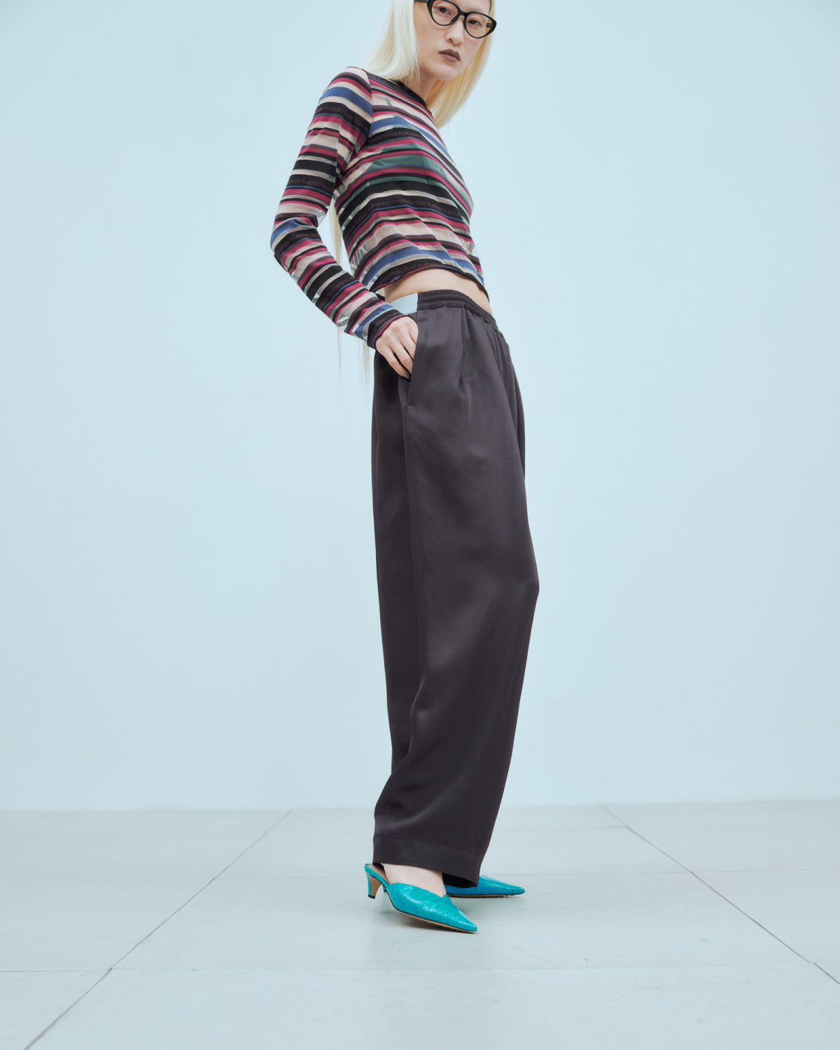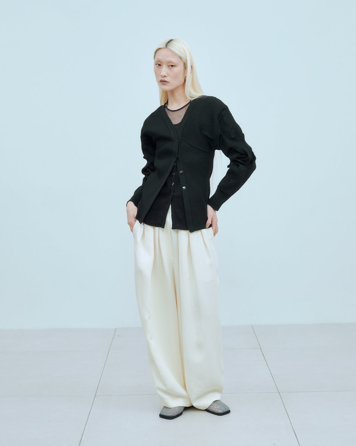 ウエストゴム仕様で履きやすく、後ろに接ぎを入れた丸みのあるシルエットが特徴のパンツ。見せかけの前開きデザインがさりげないポイントです。