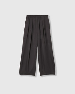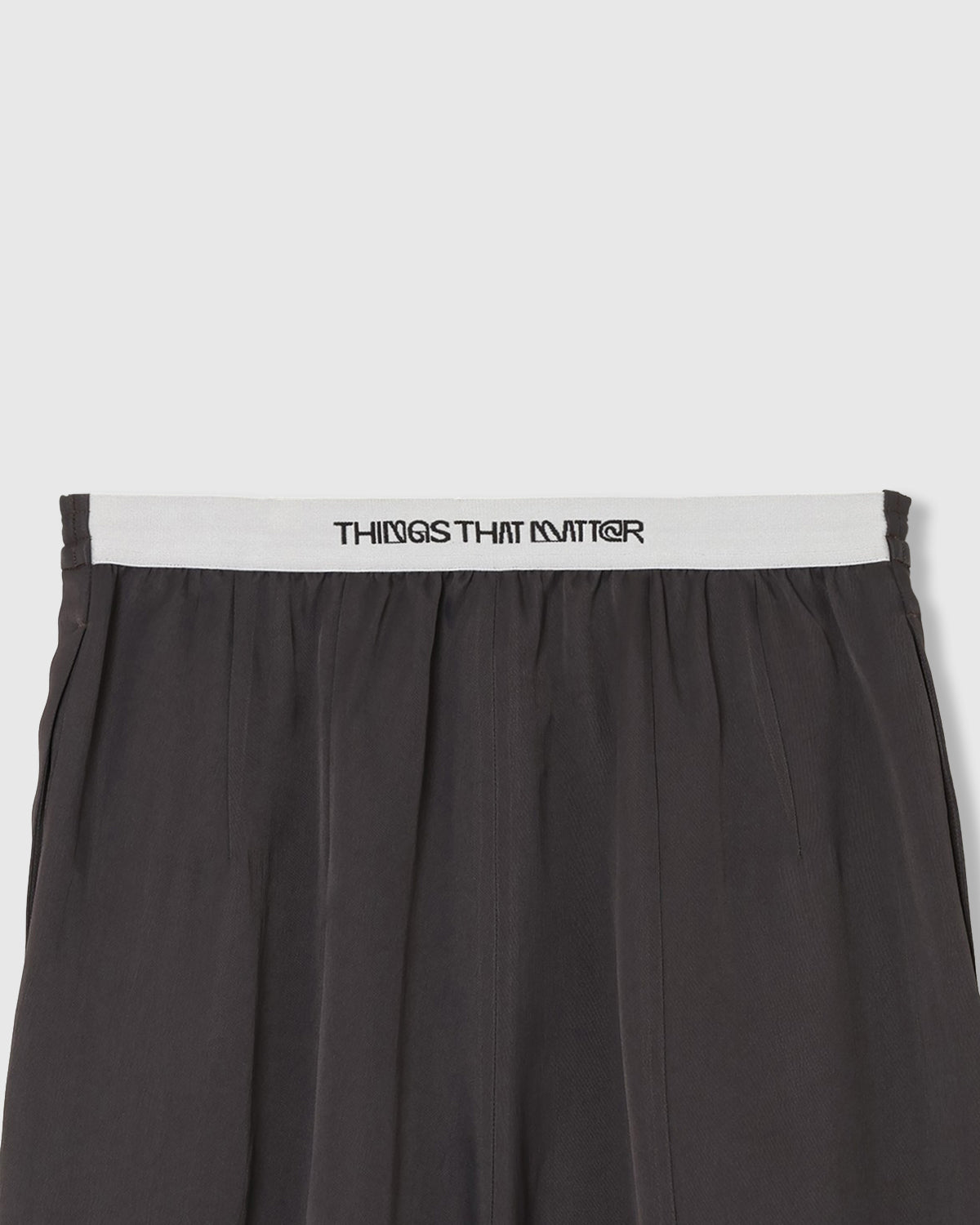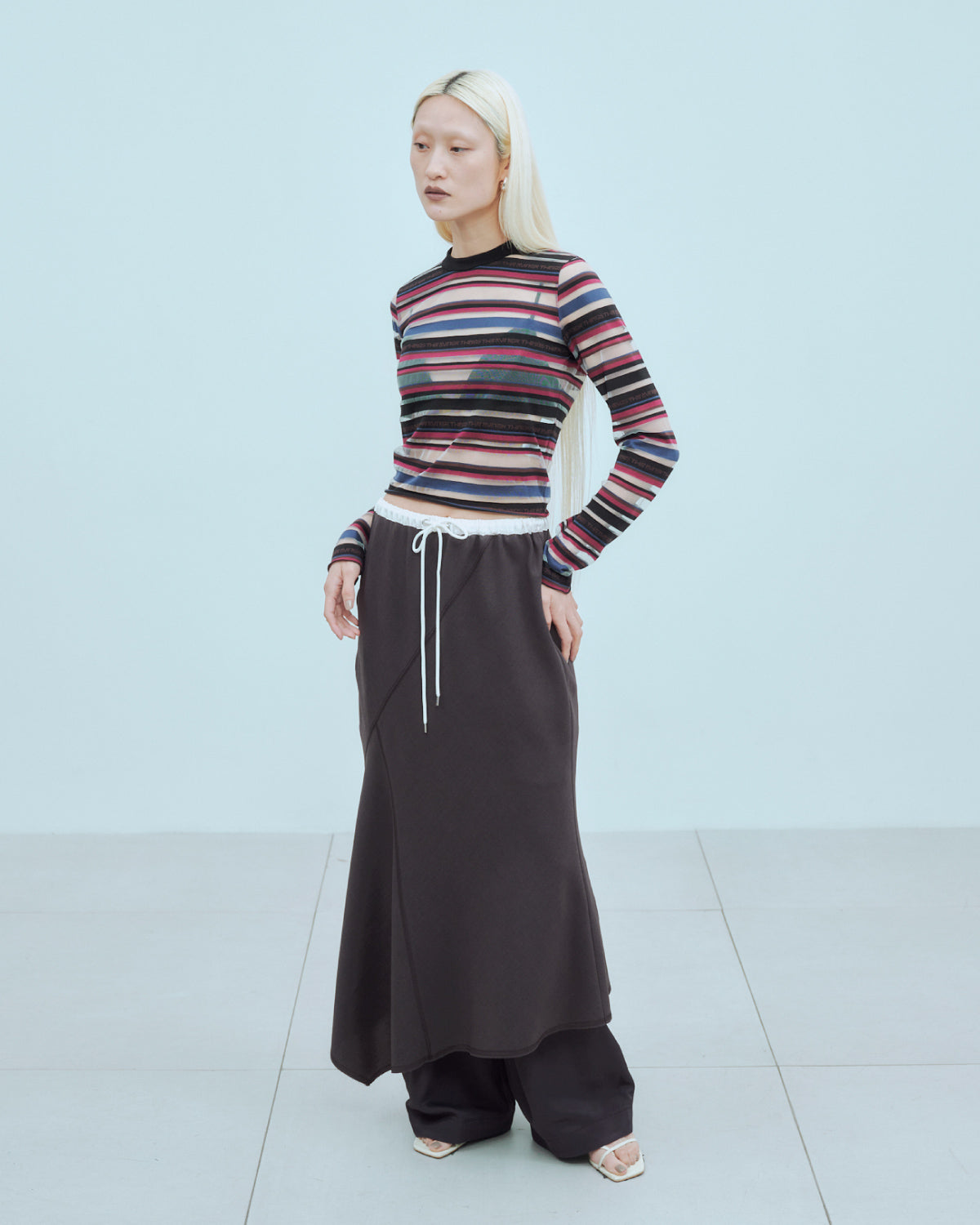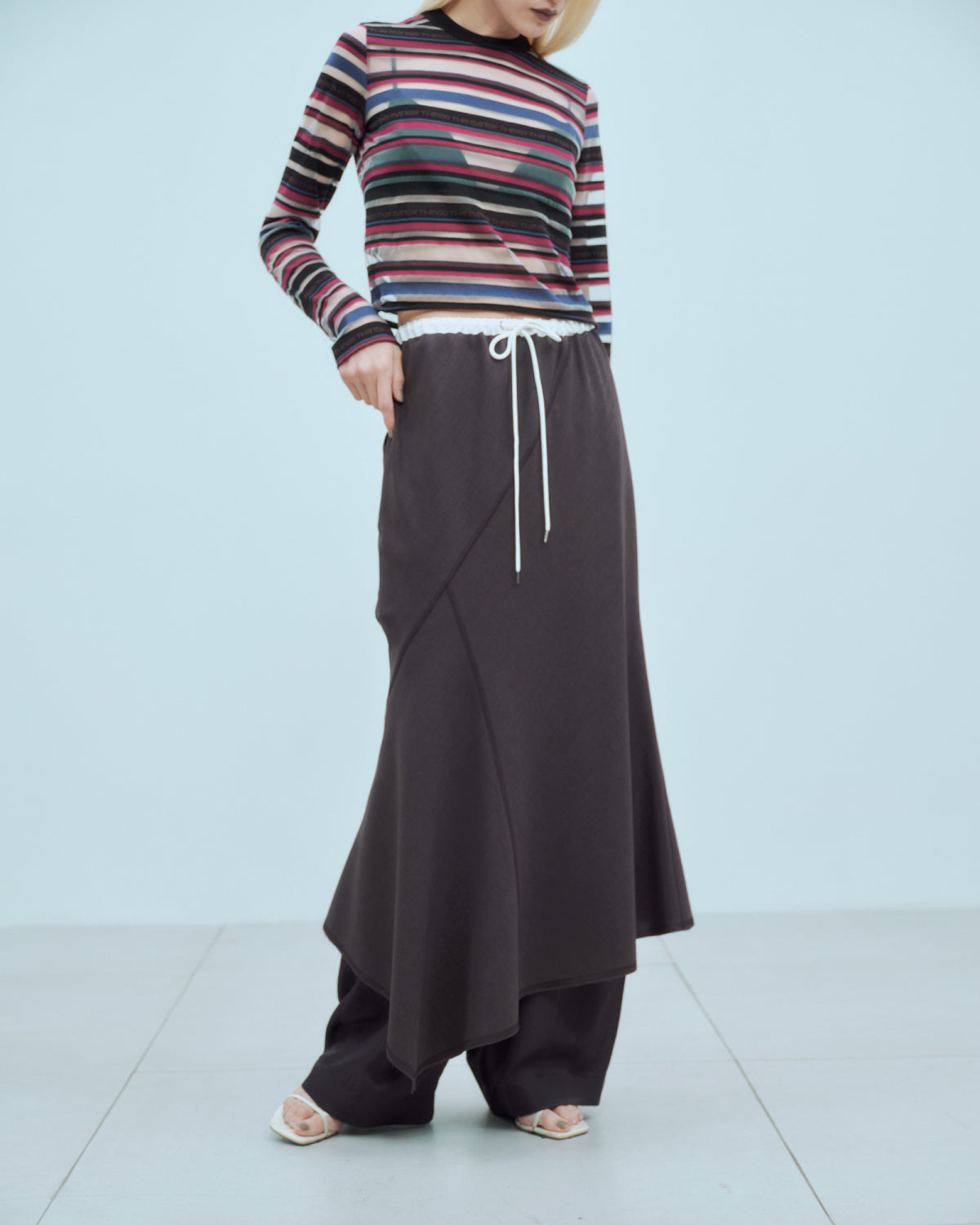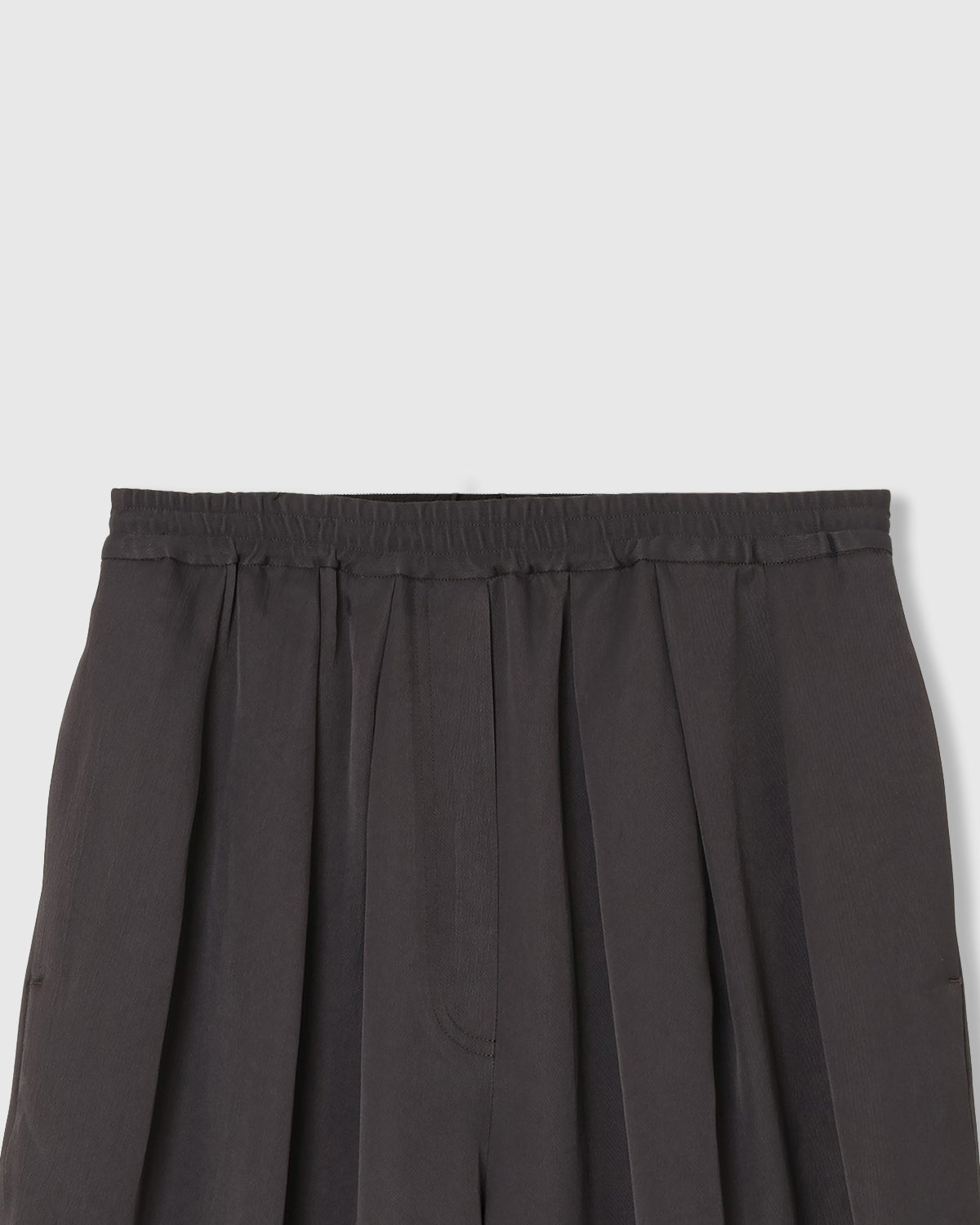 ウエストゴム仕様で履きやすく、後ろに接ぎを入れた丸みのあるシルエットが特徴のパンツ。見せかけの前開きデザインがさりげないポイントです。