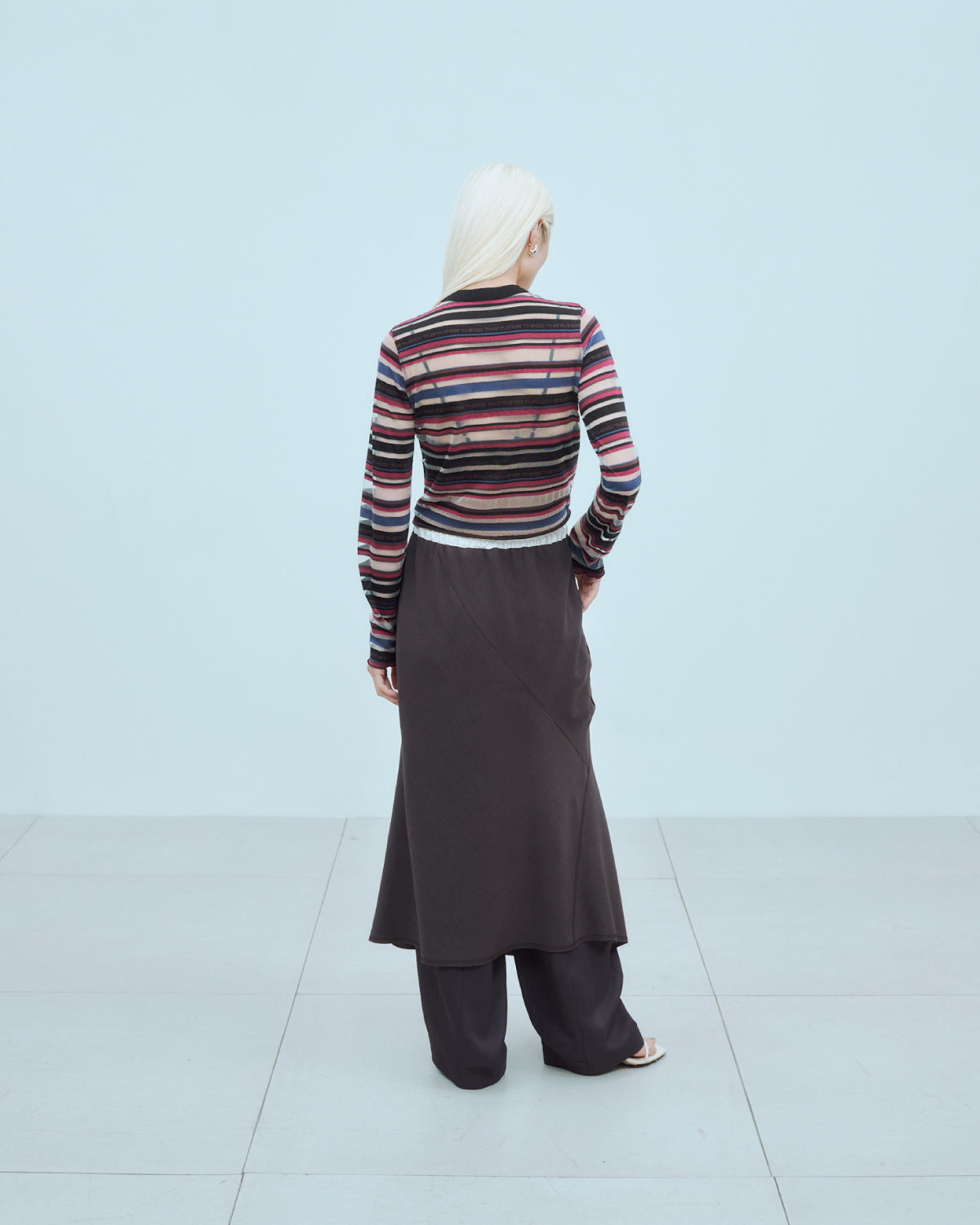 シルクのような上品な光沢、滑らかな肌触り、ドレープ性、軽い着心地が特徴のアセテート素材を使用しています。