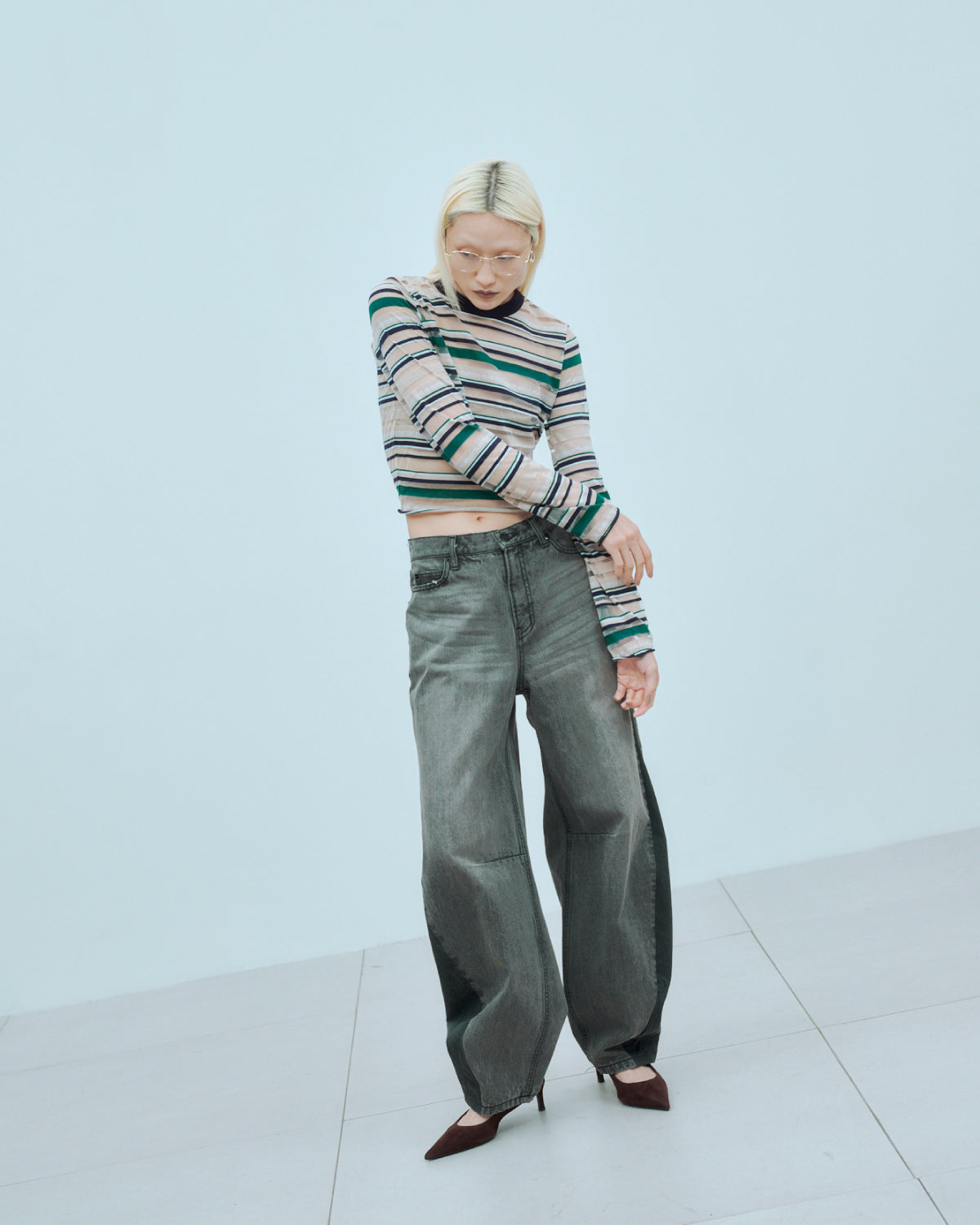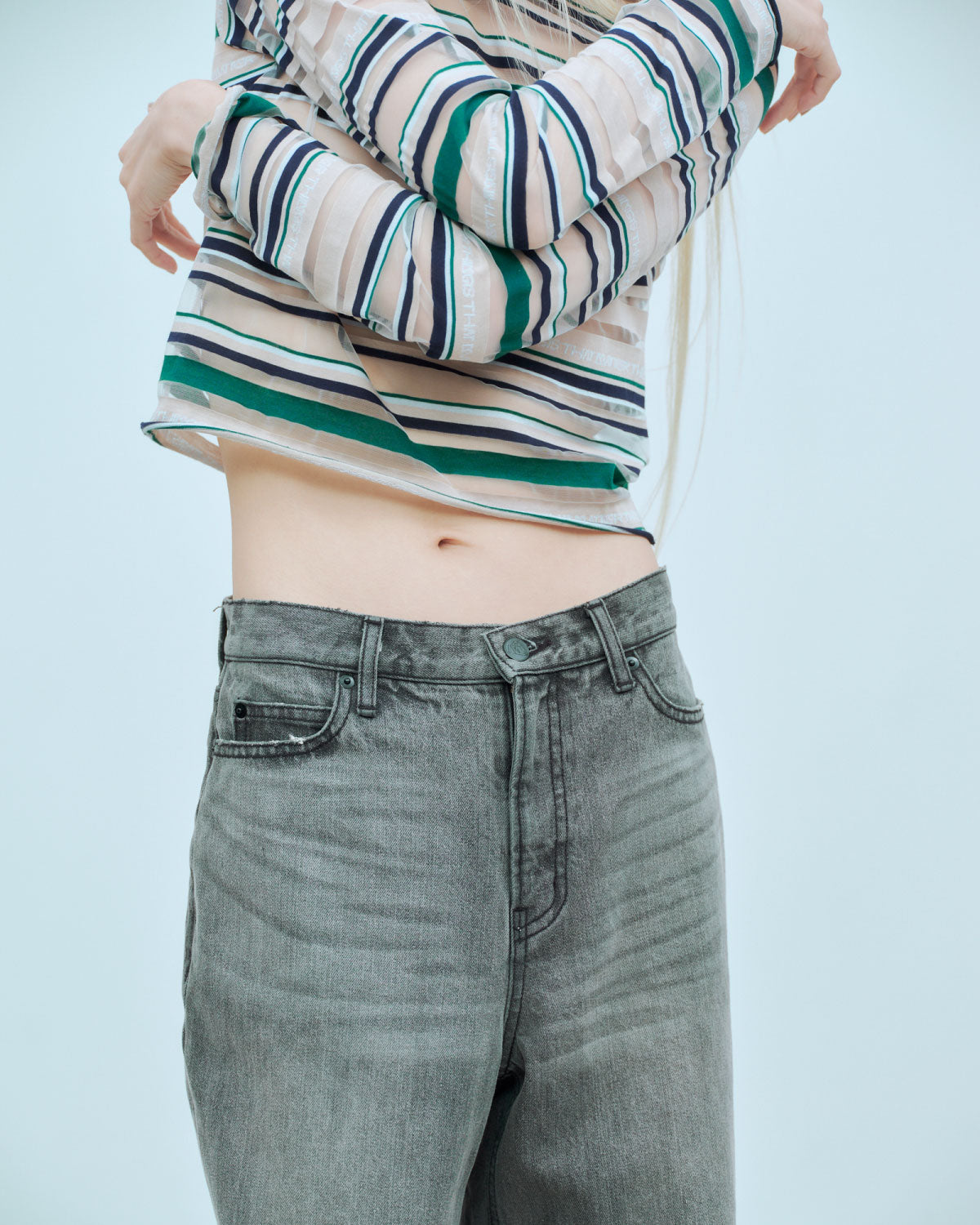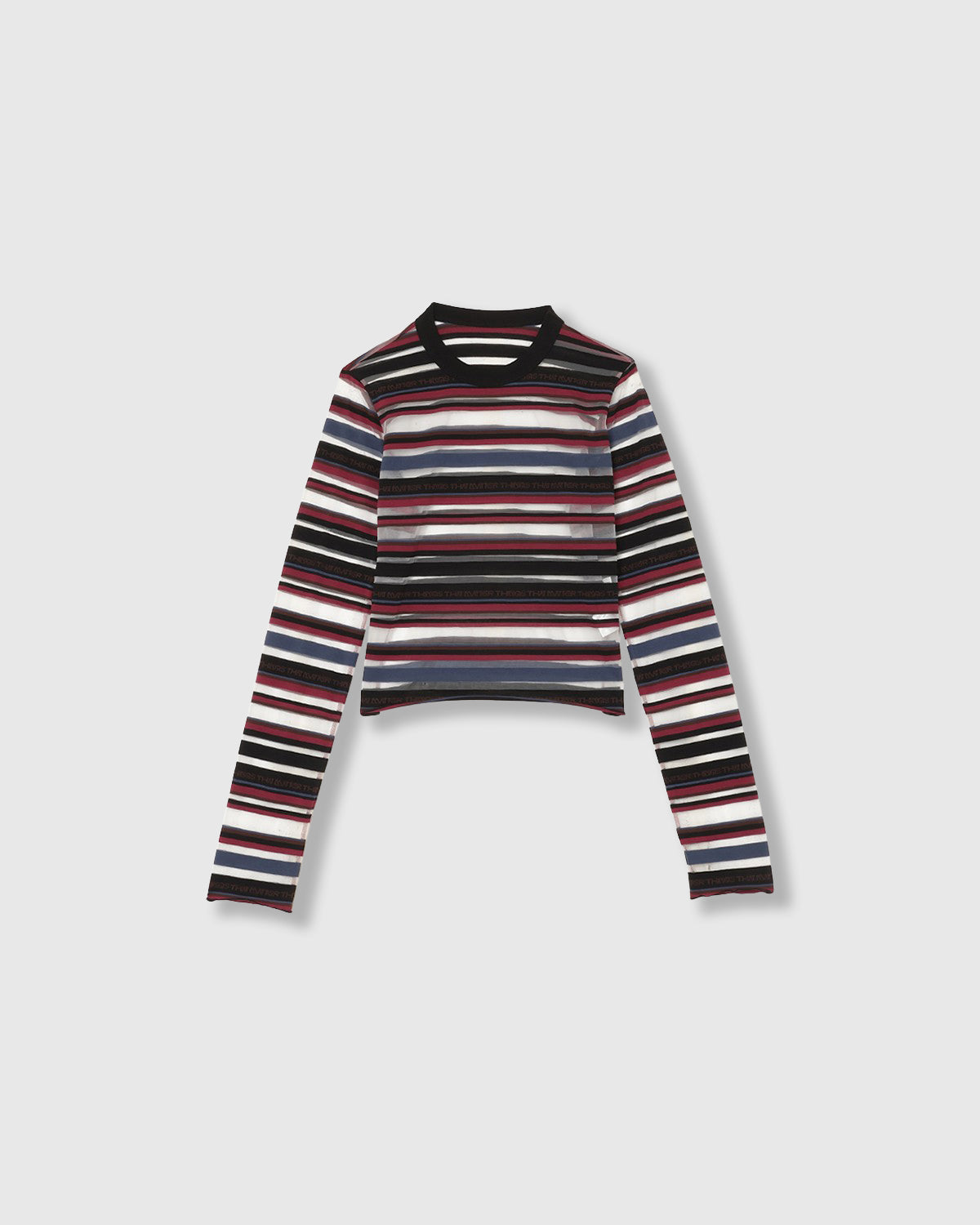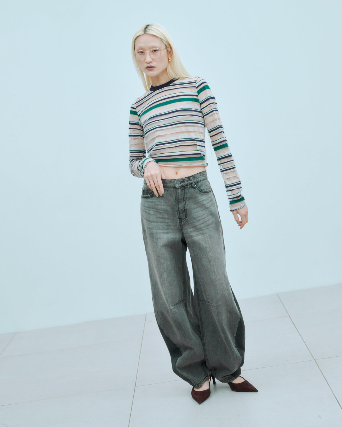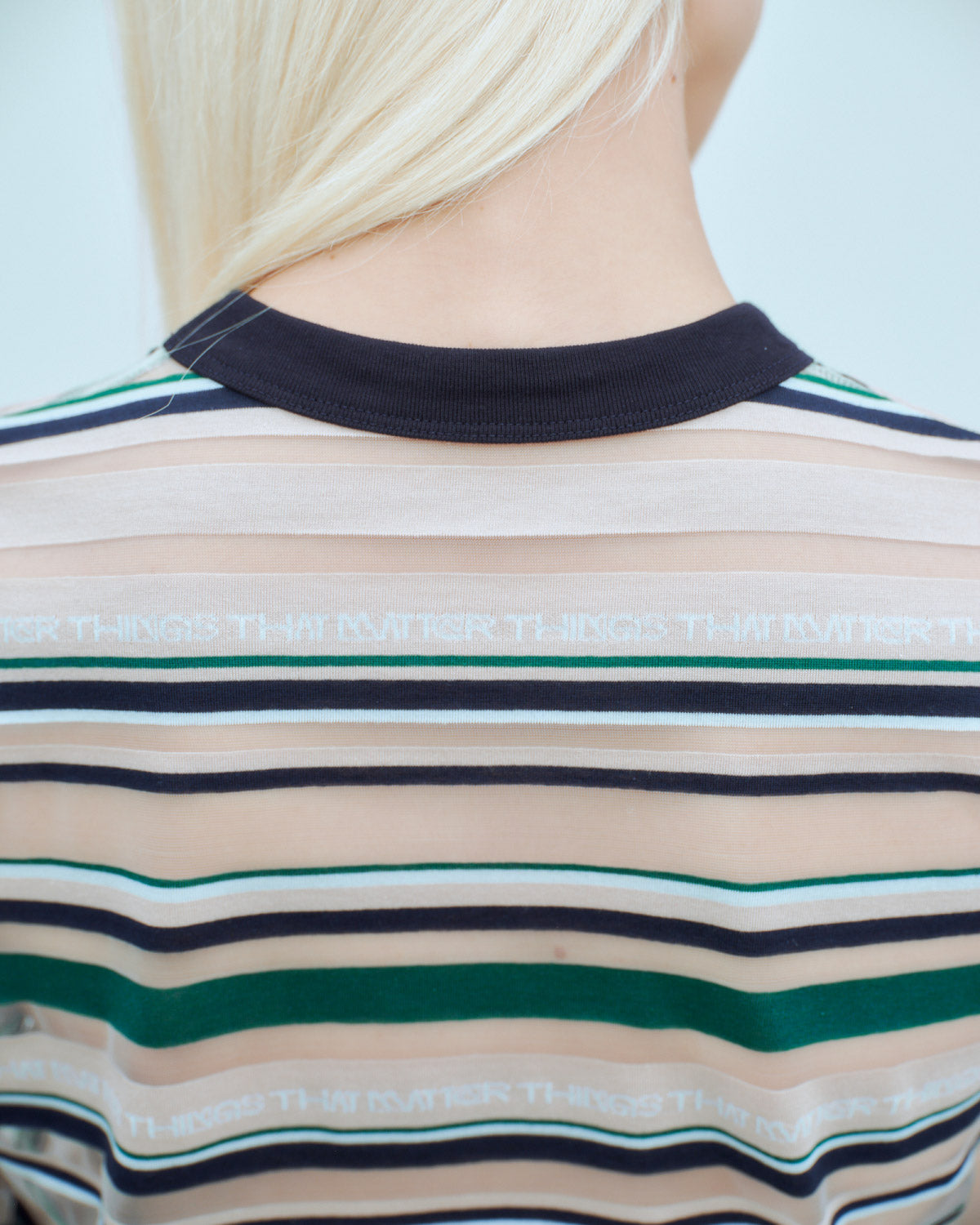 今年のトレンドであるボーダーデザインを、軽やかなシアー素材で仕立てたショートトップス。コンパクトなシルエットが特徴で、ジャケットなどのインナーやボリュームのあるボトムスとの相性も抜群です。