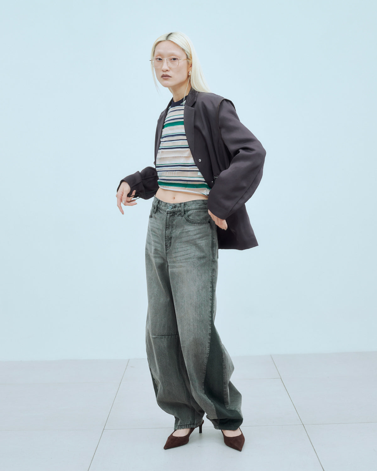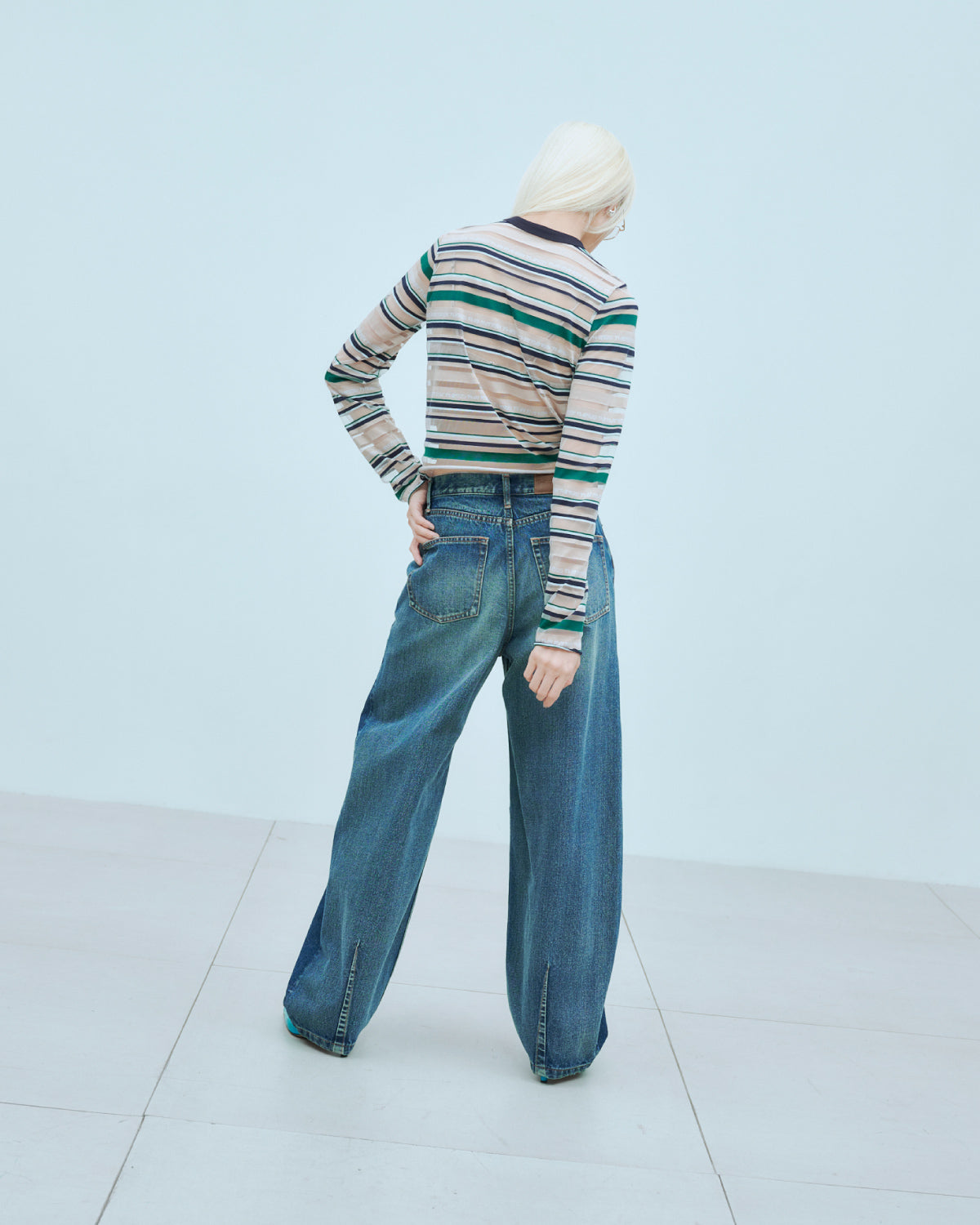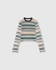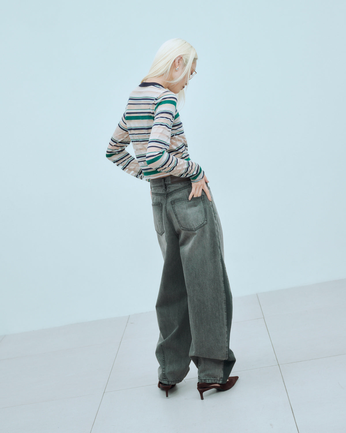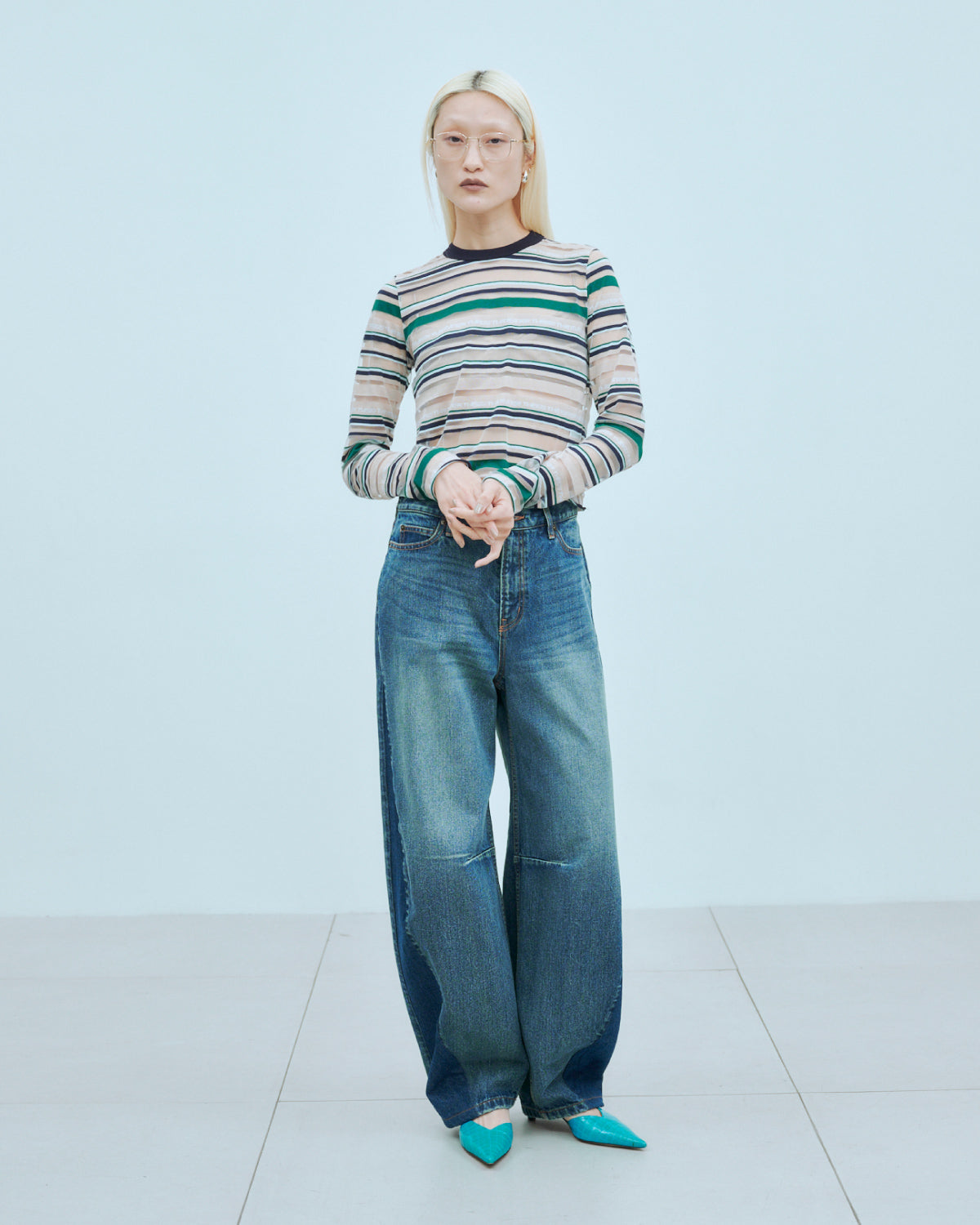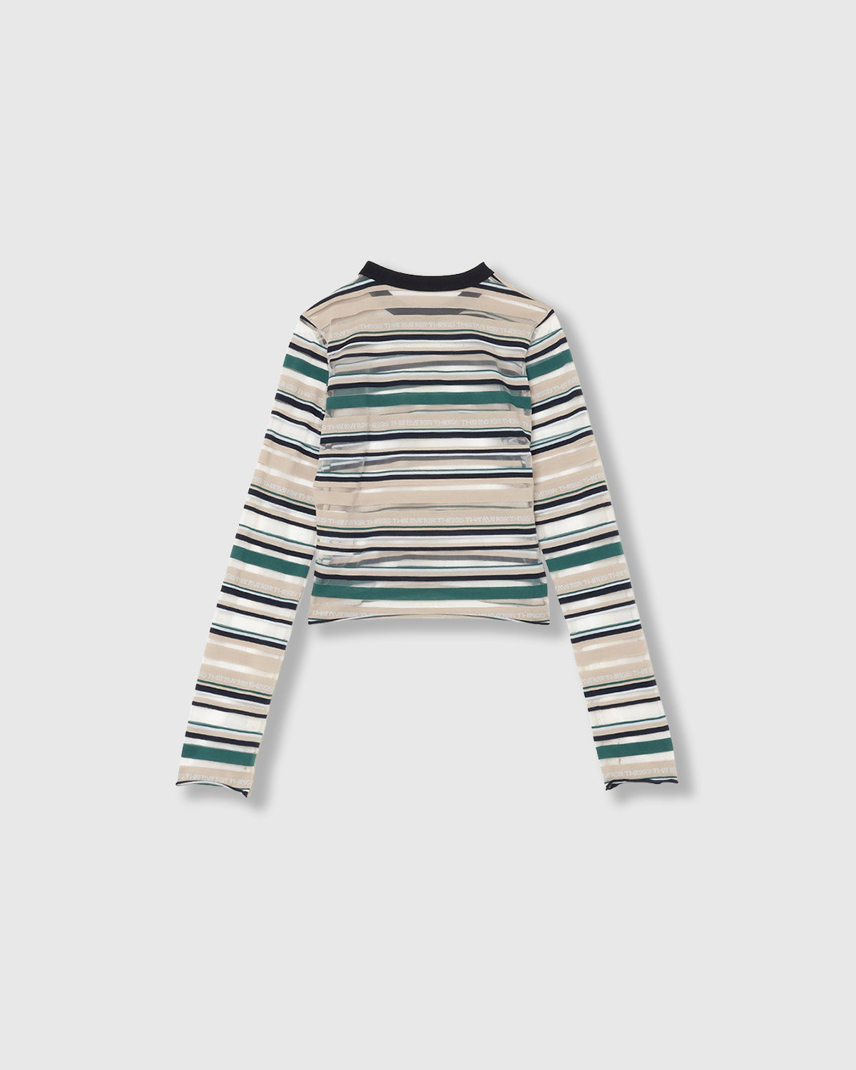 今年のトレンドであるボーダーデザインを、軽やかなシアー素材で仕立てたショートトップス。コンパクトなシルエットが特徴で、ジャケットなどのインナーやボリュームのあるボトムスとの相性も抜群です。