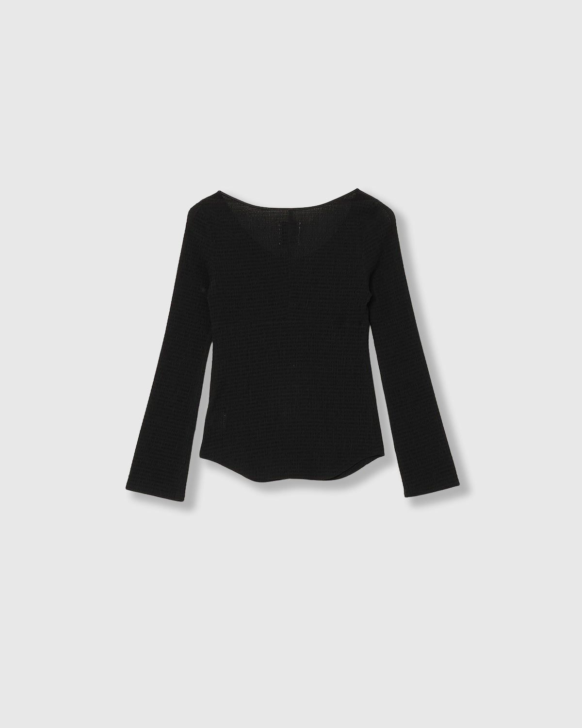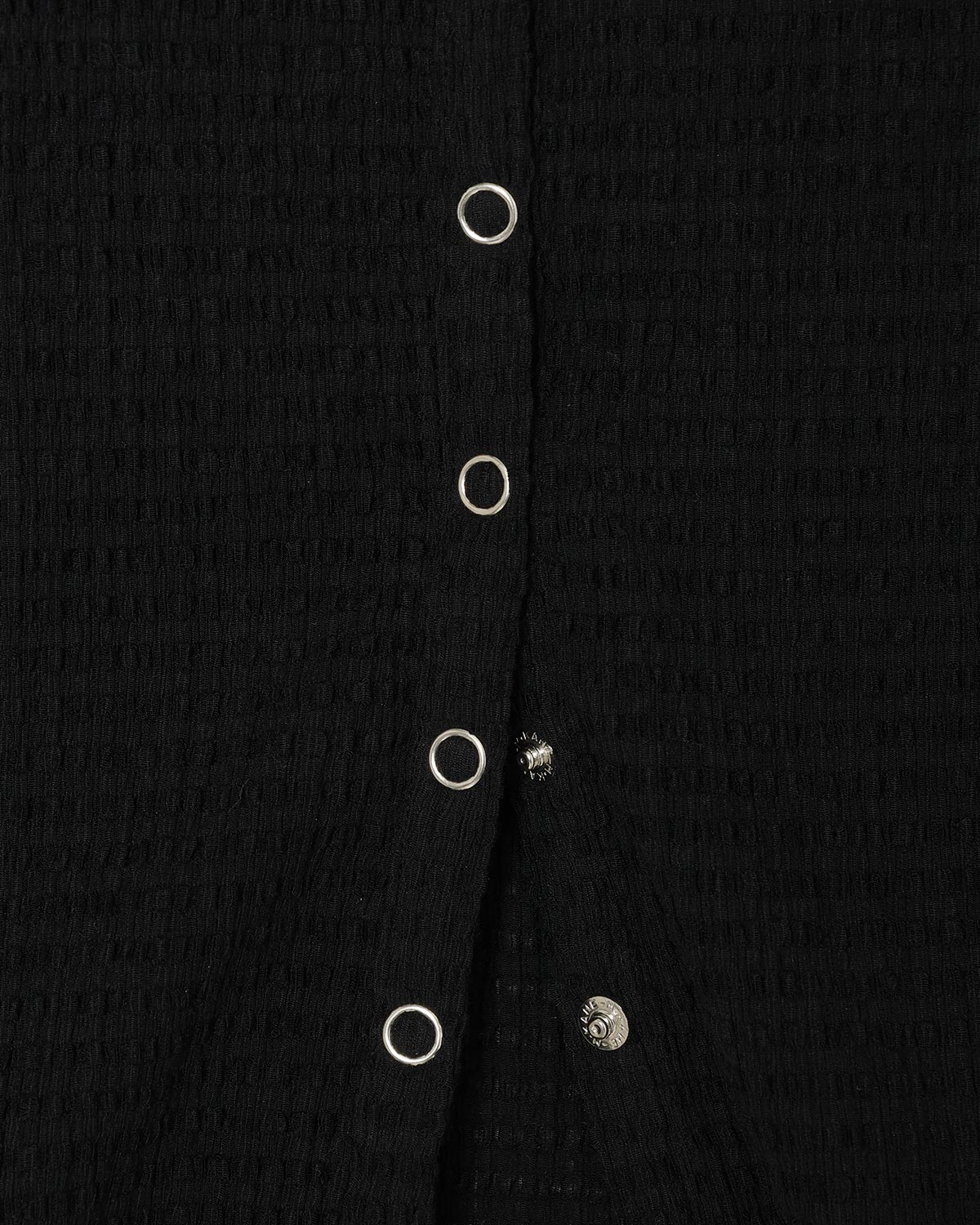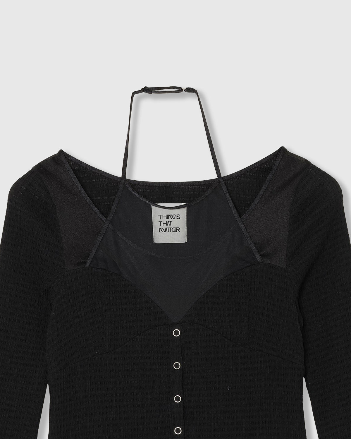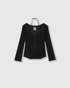 ビスチェのような切り替えのデザインが特徴のトップス。胸元はチュールとシフォン素材で透け感をプラスし、前裾は開閉が可能な仕様。ボトムに合わせてアレンジが楽しめる一着です。