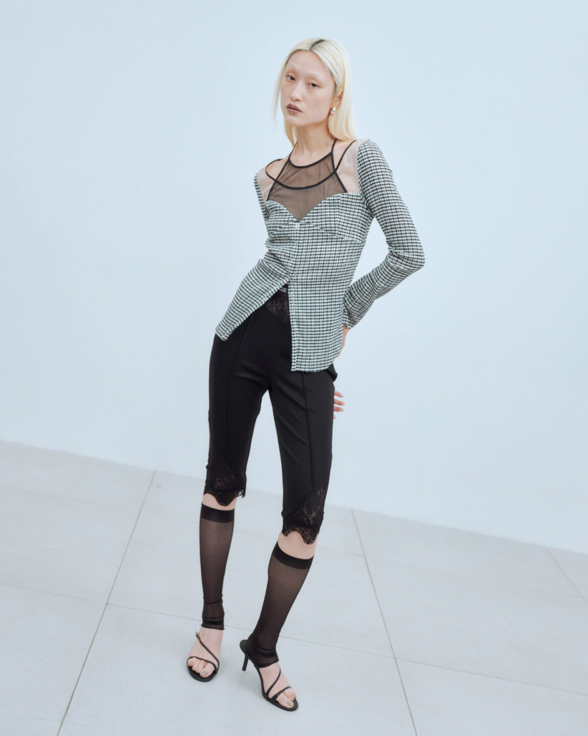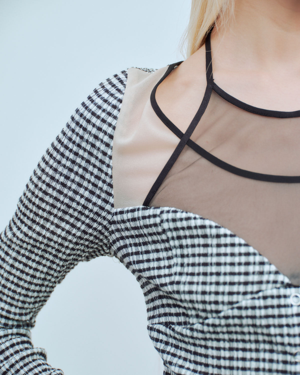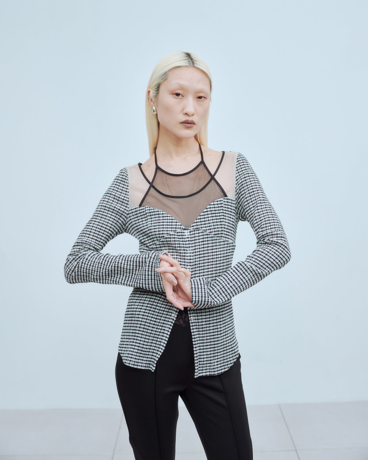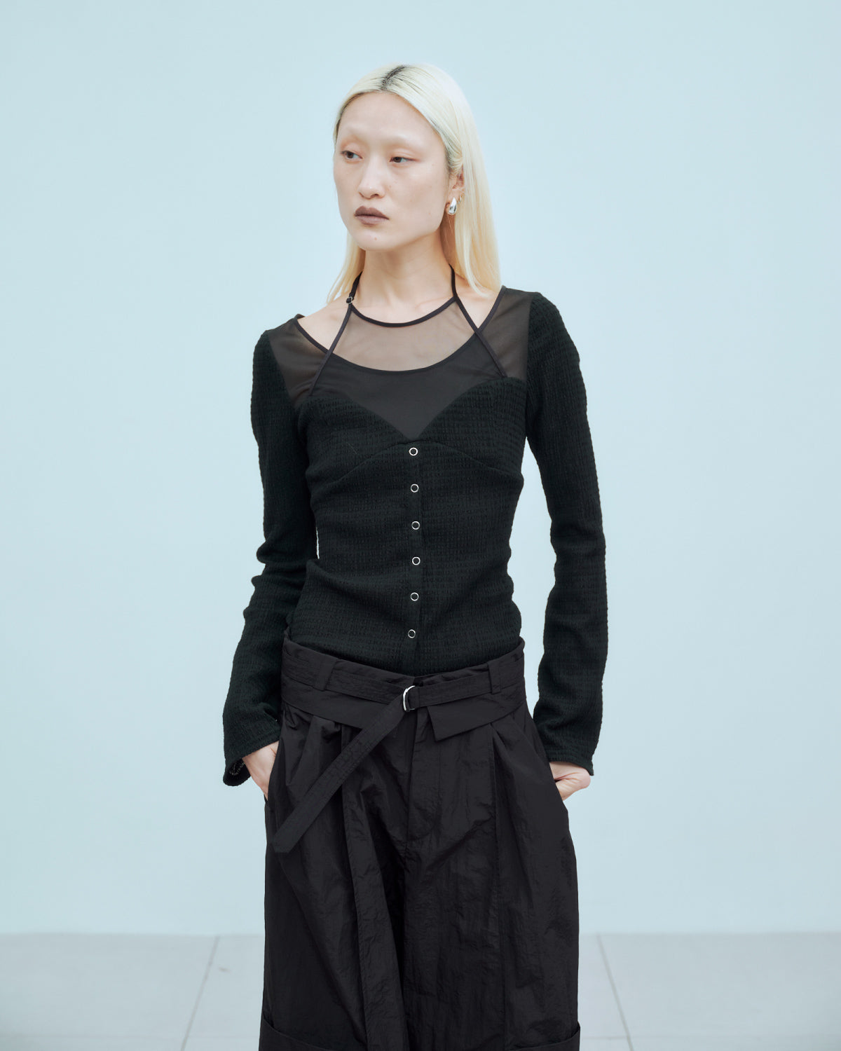ビスチェのような切り替えのデザインが特徴のトップス。胸元はチュールとシフォン素材で透け感をプラスし、前裾は開閉が可能な仕様。ボトムに合わせてアレンジが楽しめる一着です。