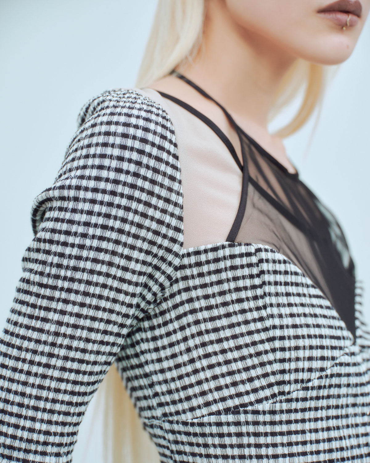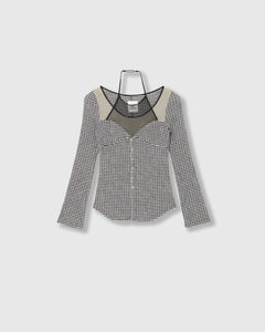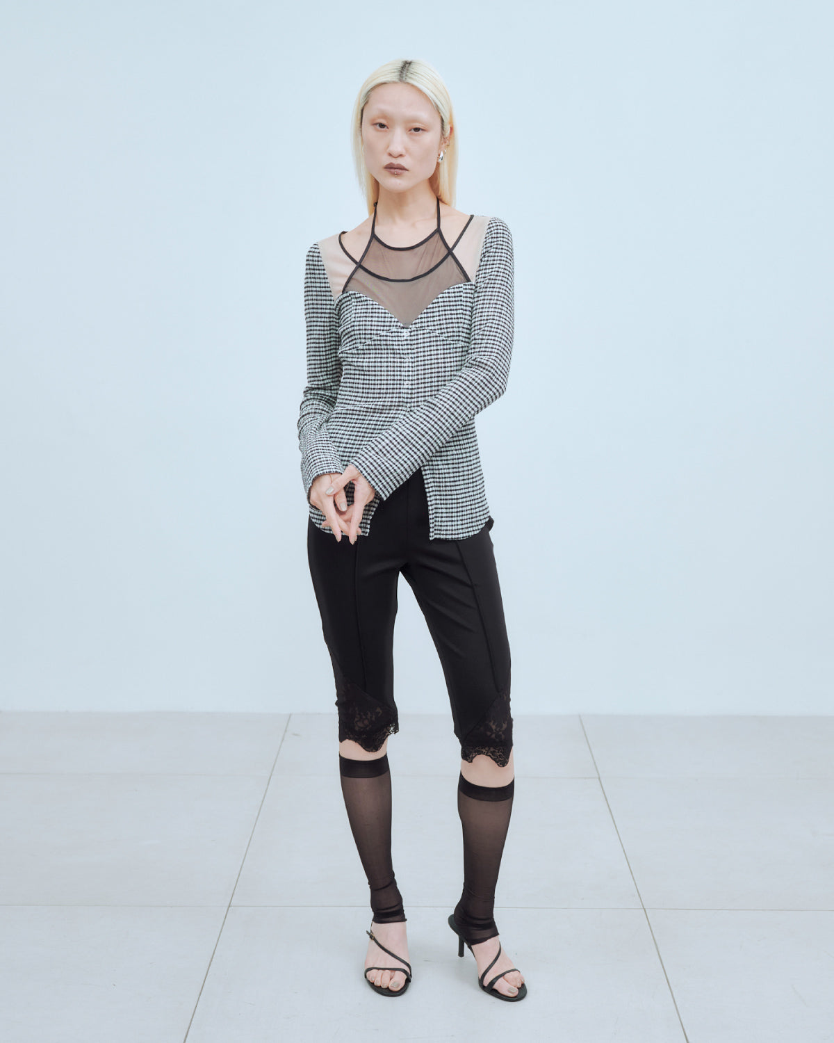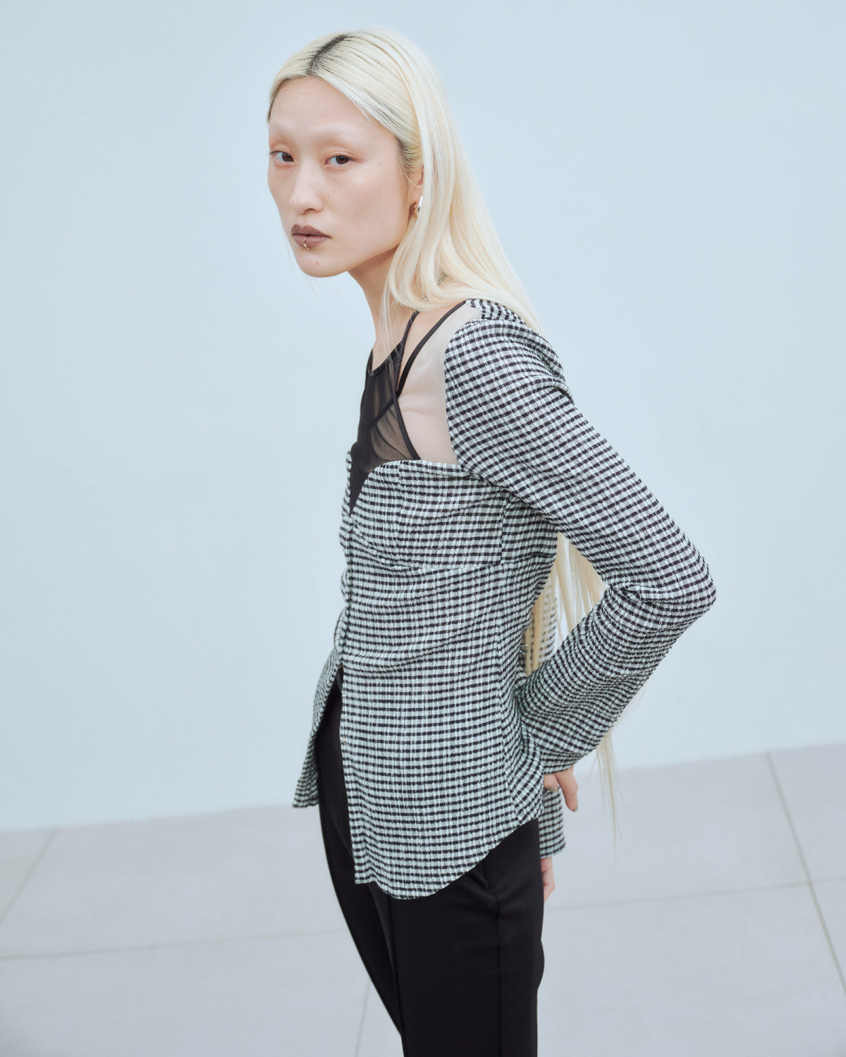 ビスチェのような切り替えのデザインが特徴のトップス。胸元はチュールとシフォン素材で透け感をプラスし、前裾は開閉が可能な仕様。ボトムに合わせてアレンジが楽しめる一着です。
