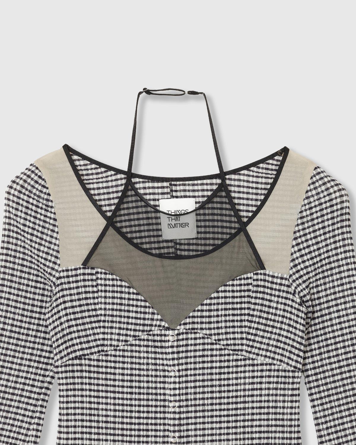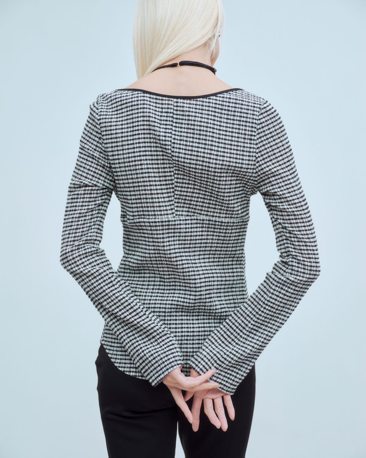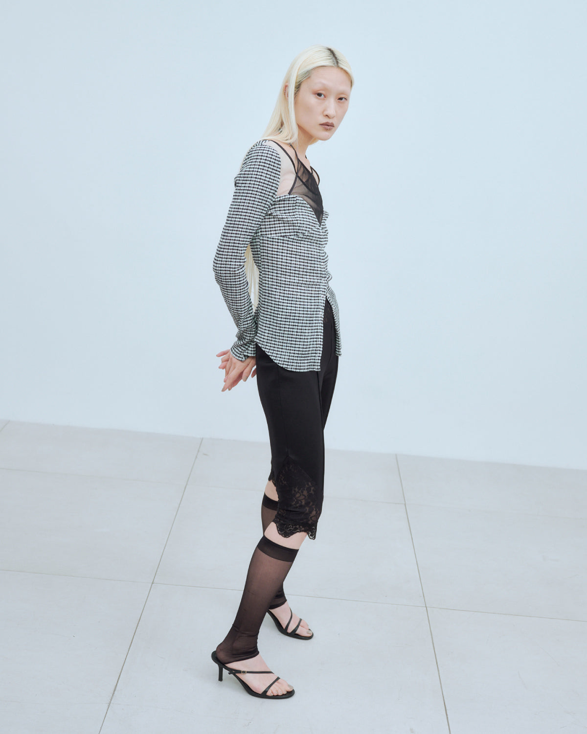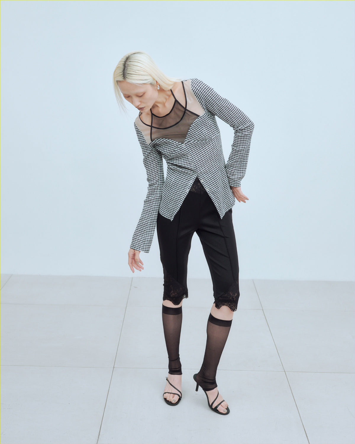 ビスチェのような切り替えのデザインが特徴のトップス。胸元はチュールとシフォン素材で透け感をプラスし、前裾は開閉が可能な仕様。ボトムに合わせてアレンジが楽しめる一着です。