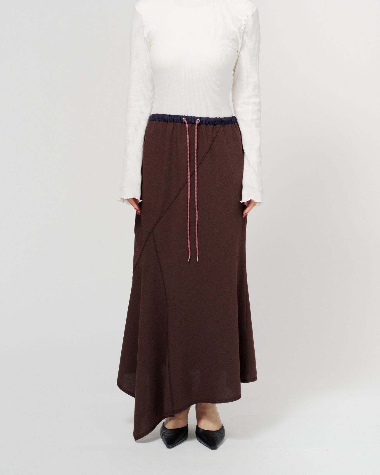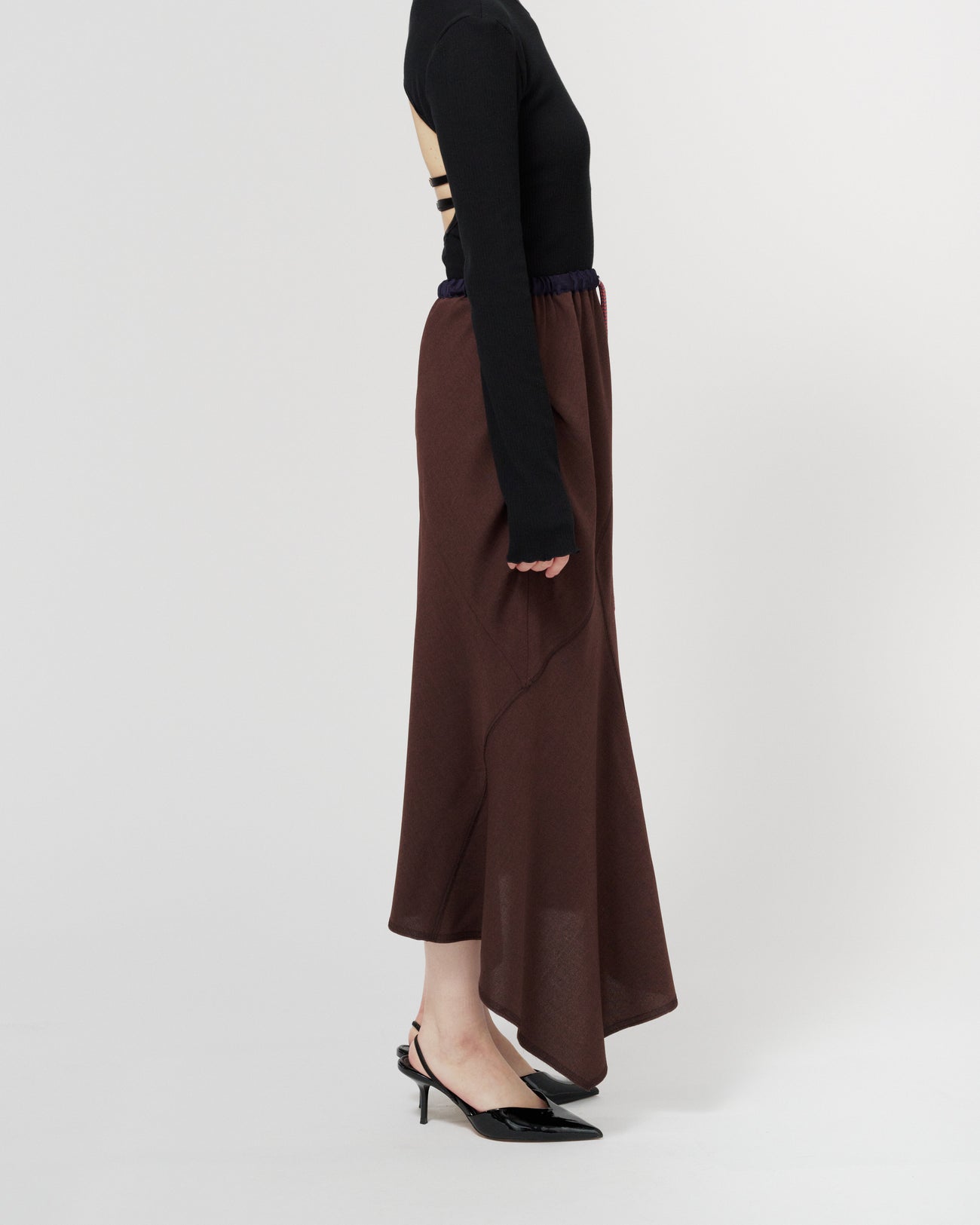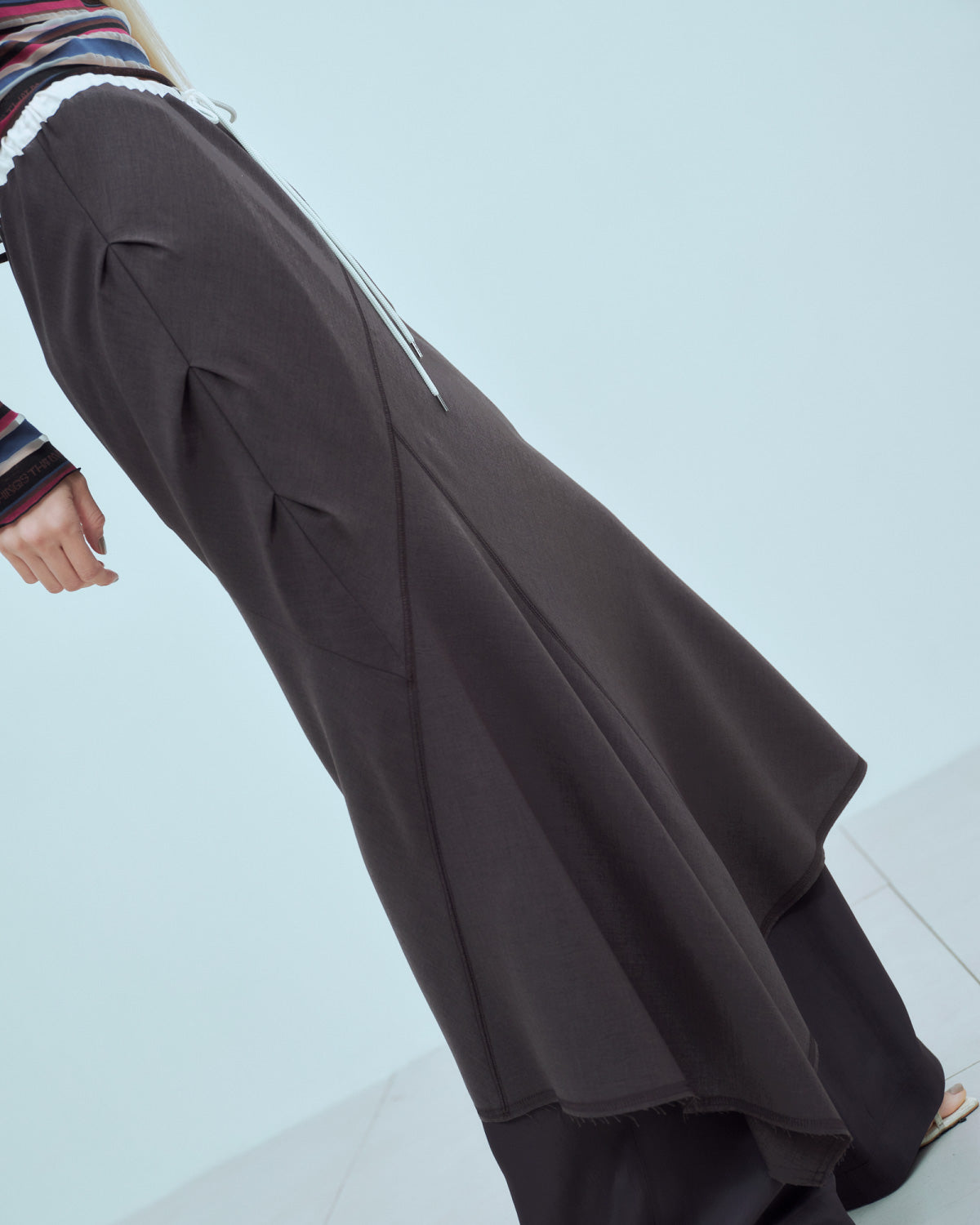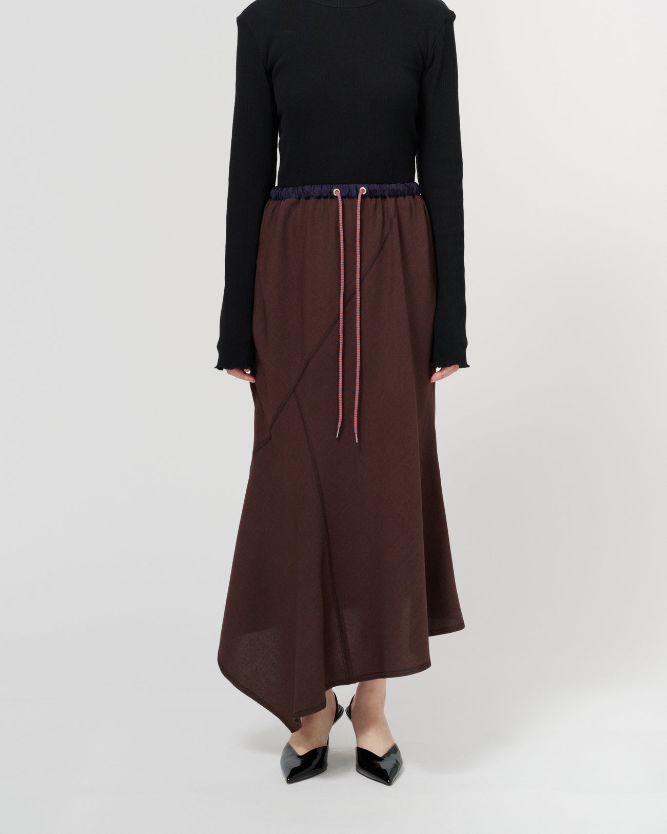 ウエストはゴムと紐で調整可能な仕様で、リラックスした履き心地が魅力のスカート。ランダムな切り替えがフレア感をプラスし、動きのあるシルエットを演出します。