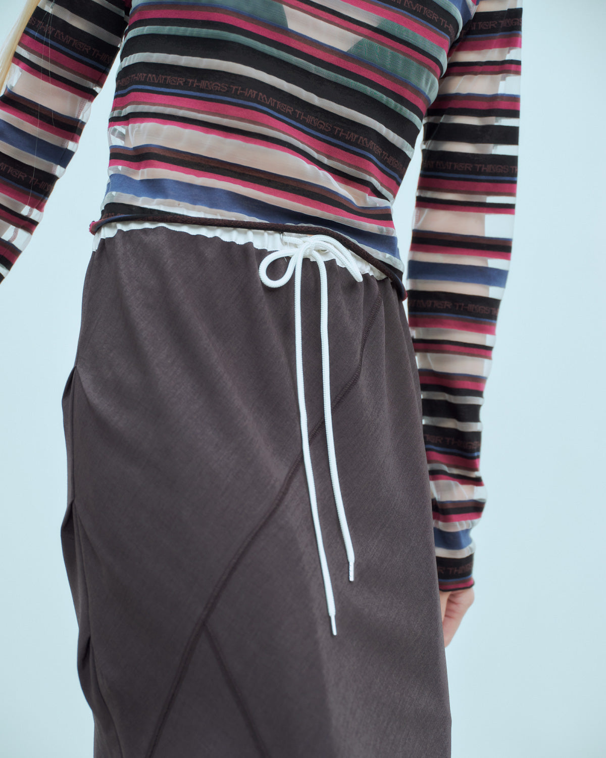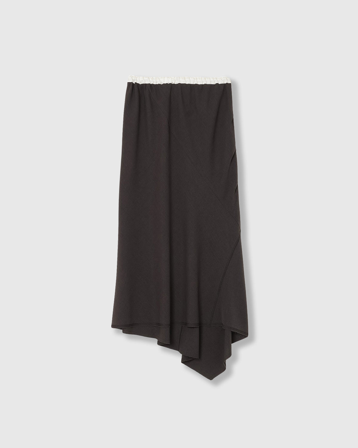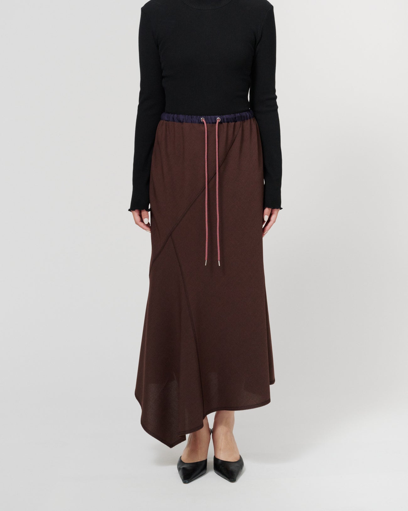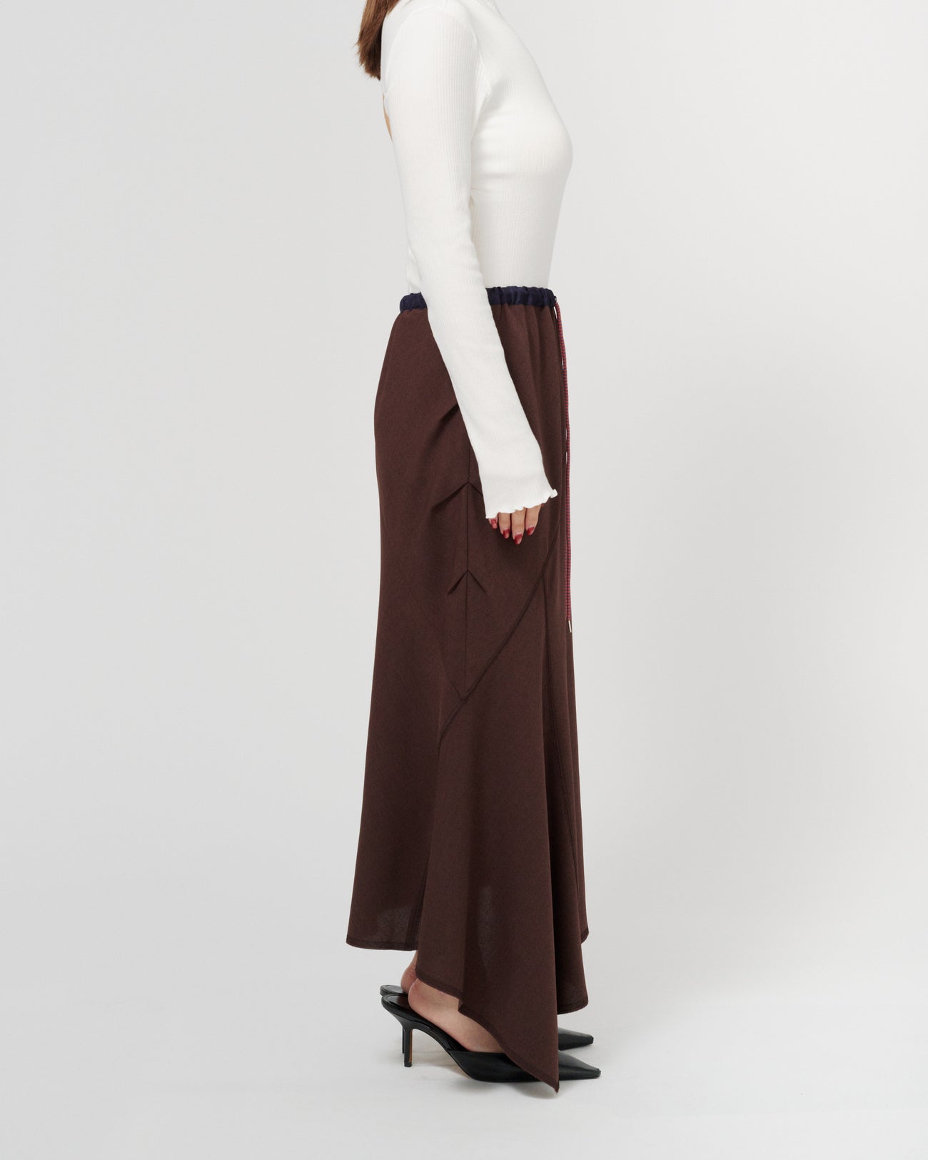 ウエストはゴムと紐で調整可能な仕様で、リラックスした履き心地が魅力のスカート。ランダムな切り替えがフレア感をプラスし、動きのあるシルエットを演出します。