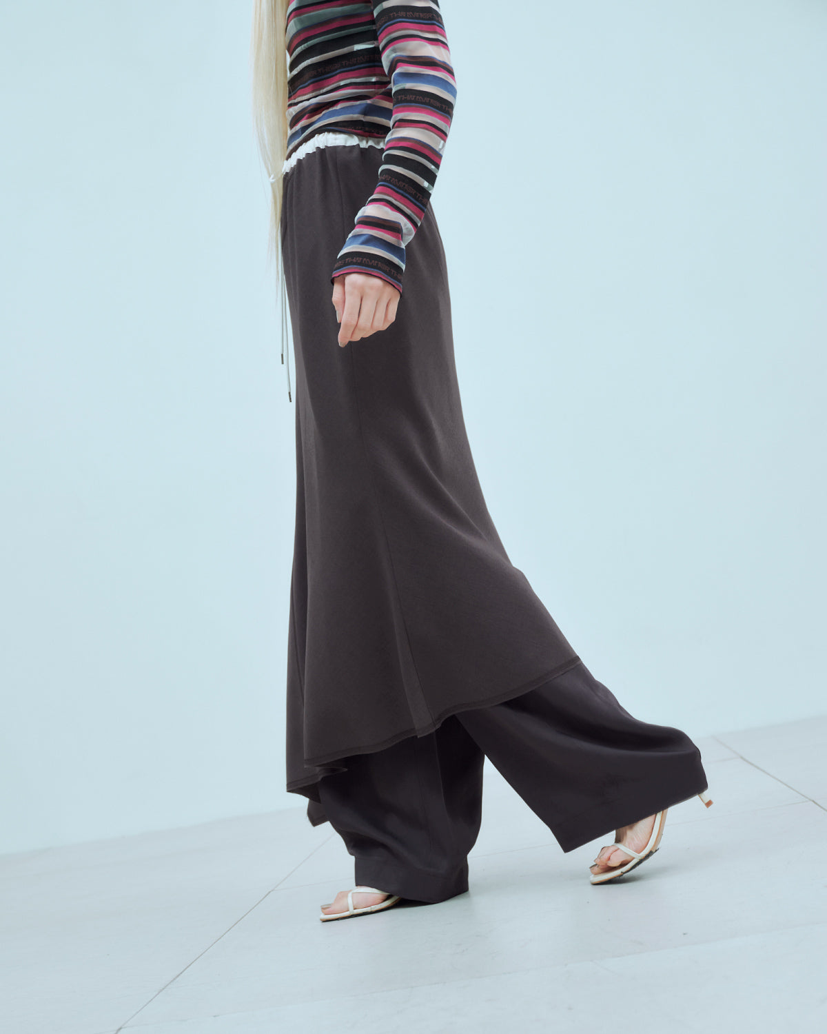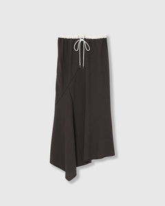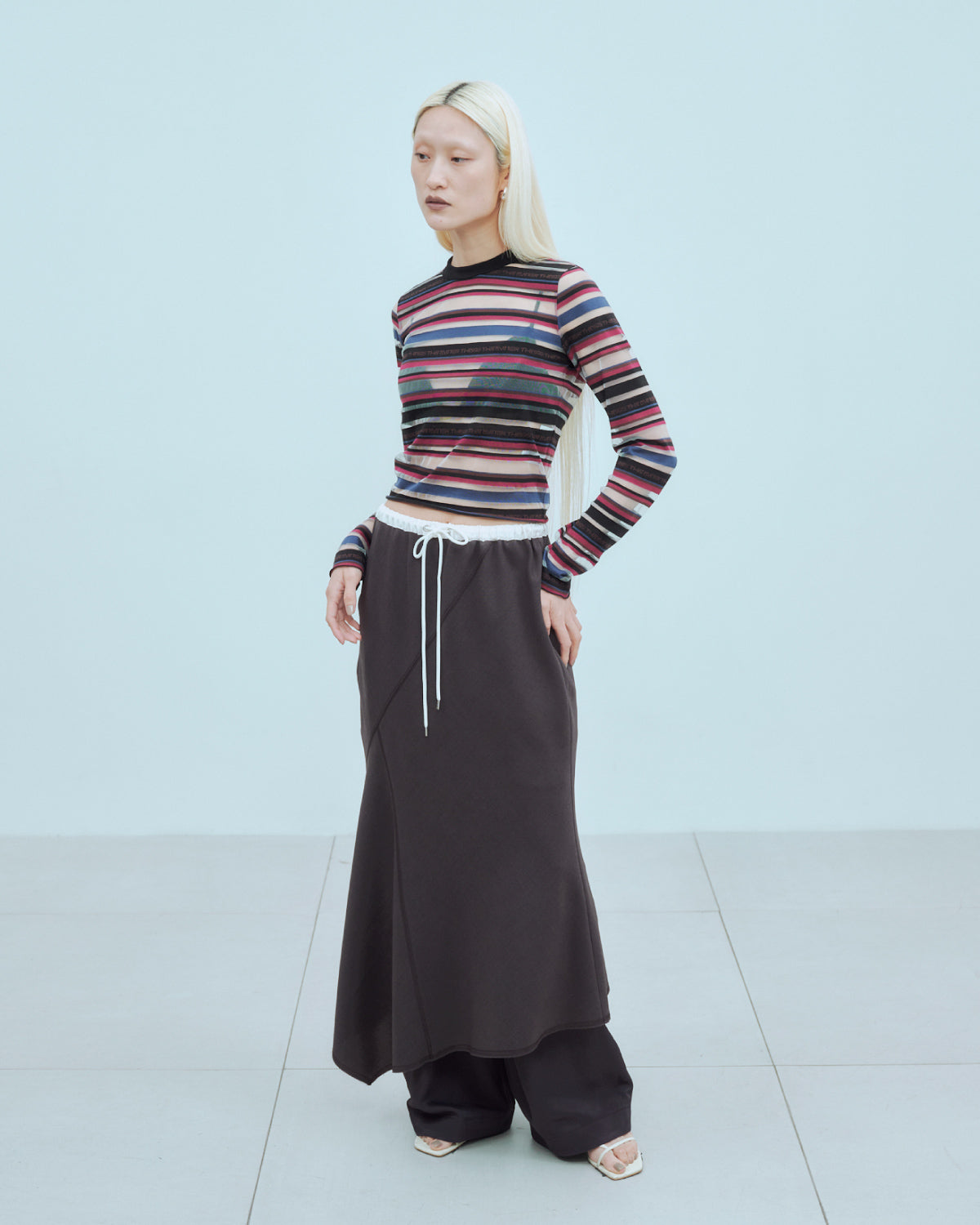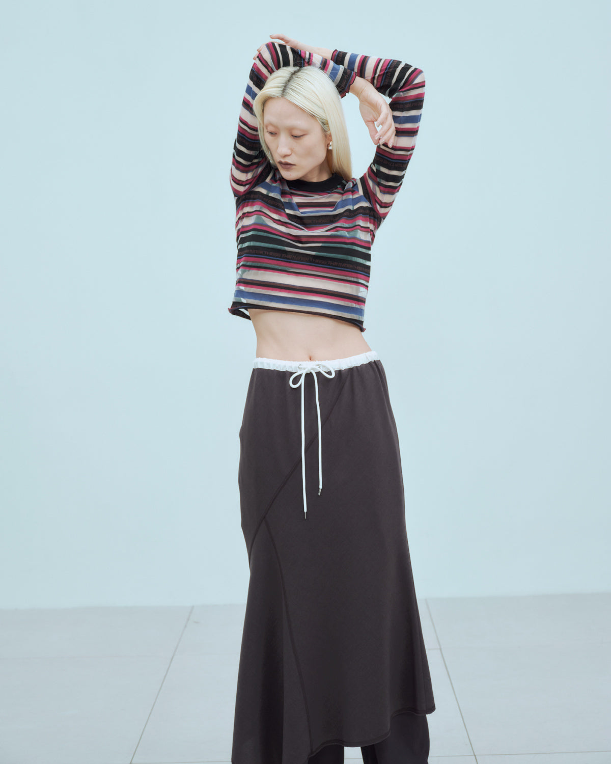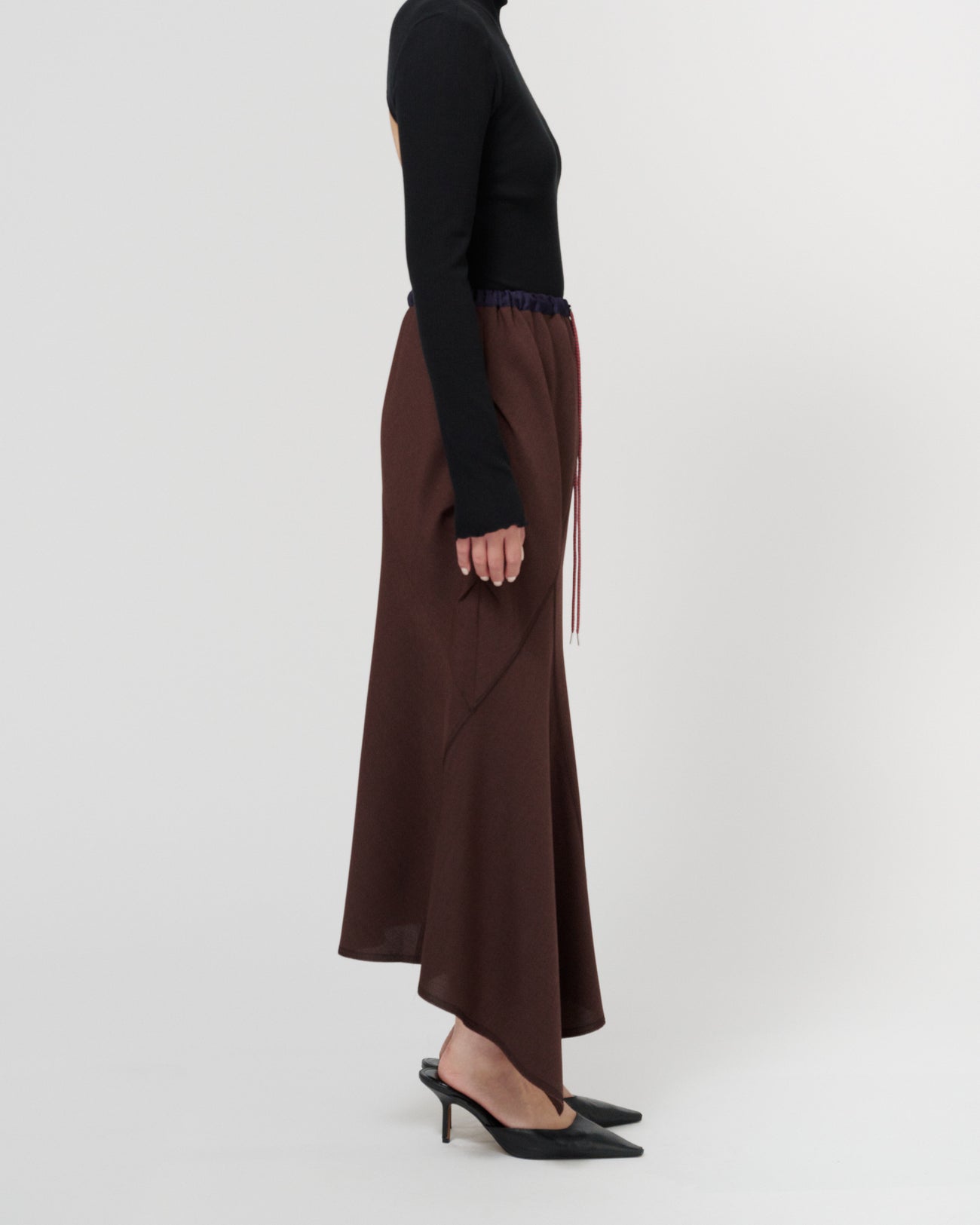 ウエストはゴムと紐で調整可能な仕様で、リラックスした履き心地が魅力のスカート。ランダムな切り替えがフレア感をプラスし、動きのあるシルエットを演出します。