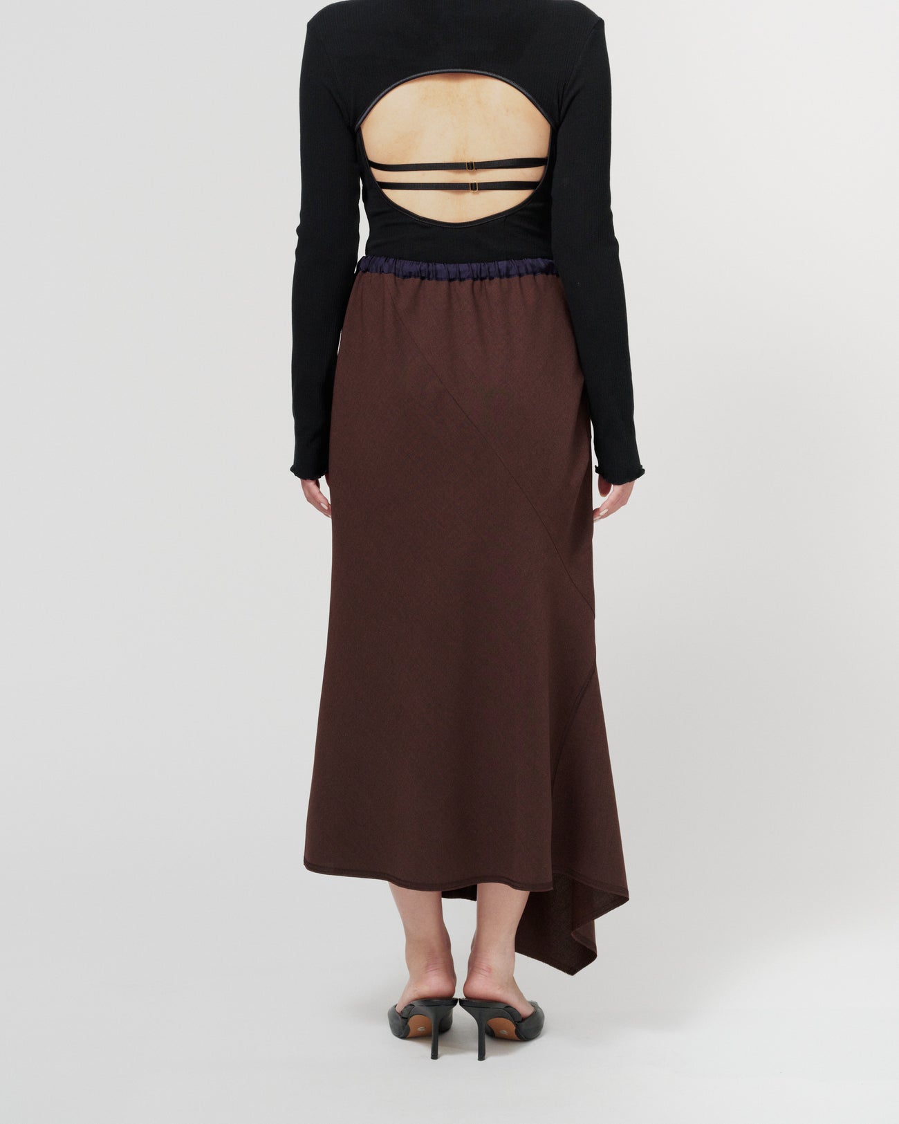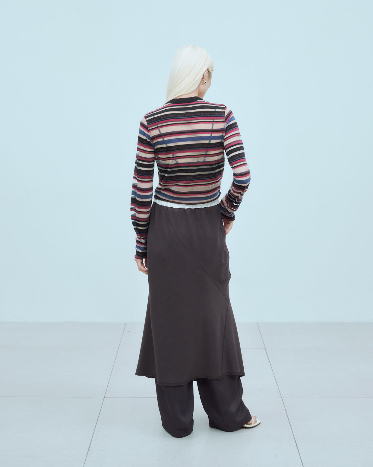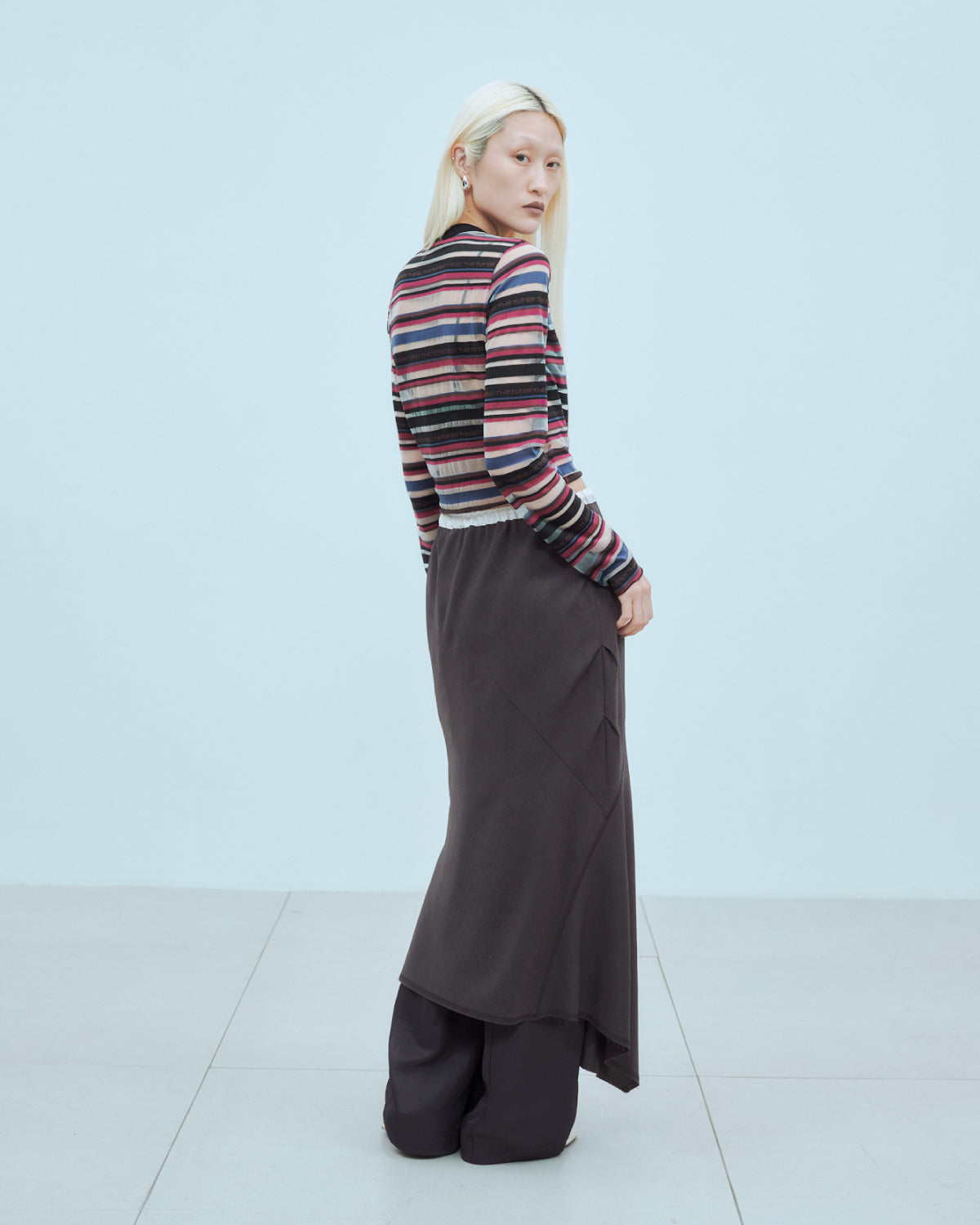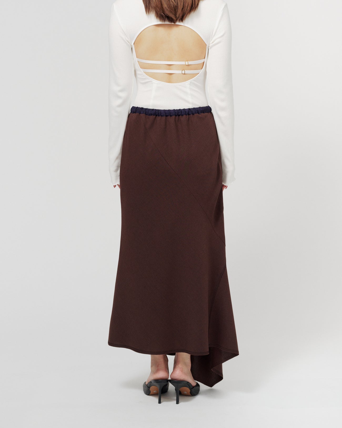 ウエストはゴムと紐で調整可能な仕様で、リラックスした履き心地が魅力のスカート。ランダムな切り替えがフレア感をプラスし、動きのあるシルエットを演出します。