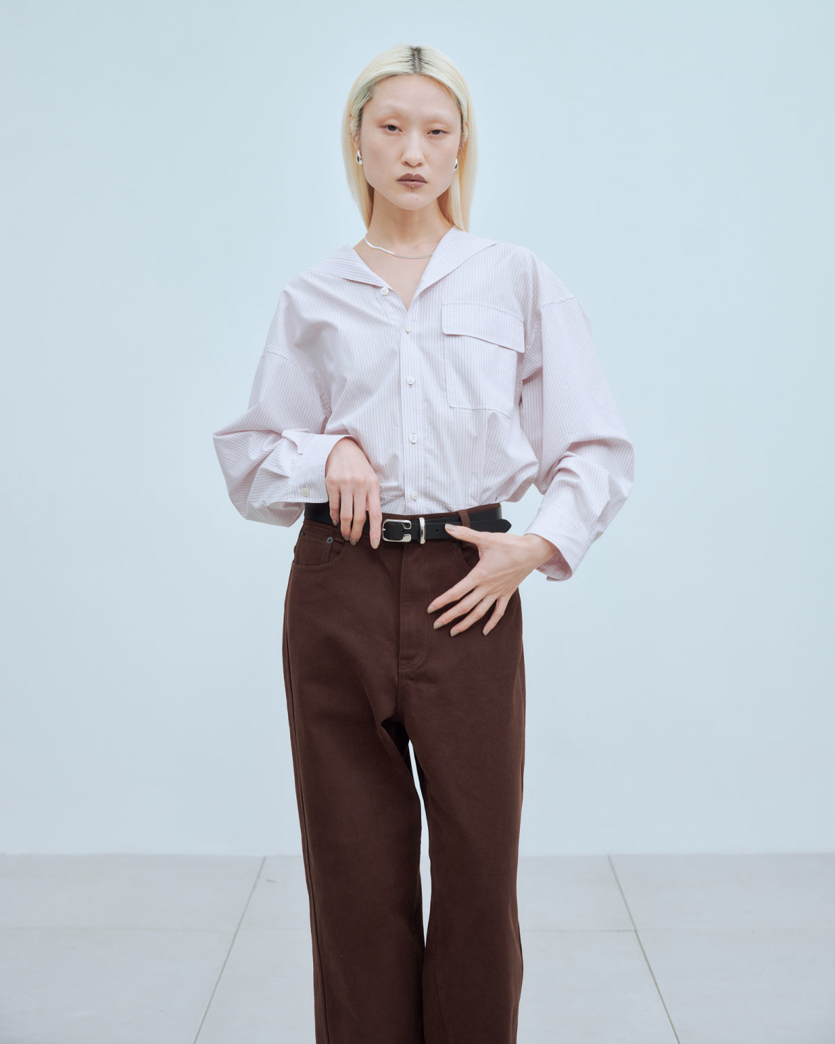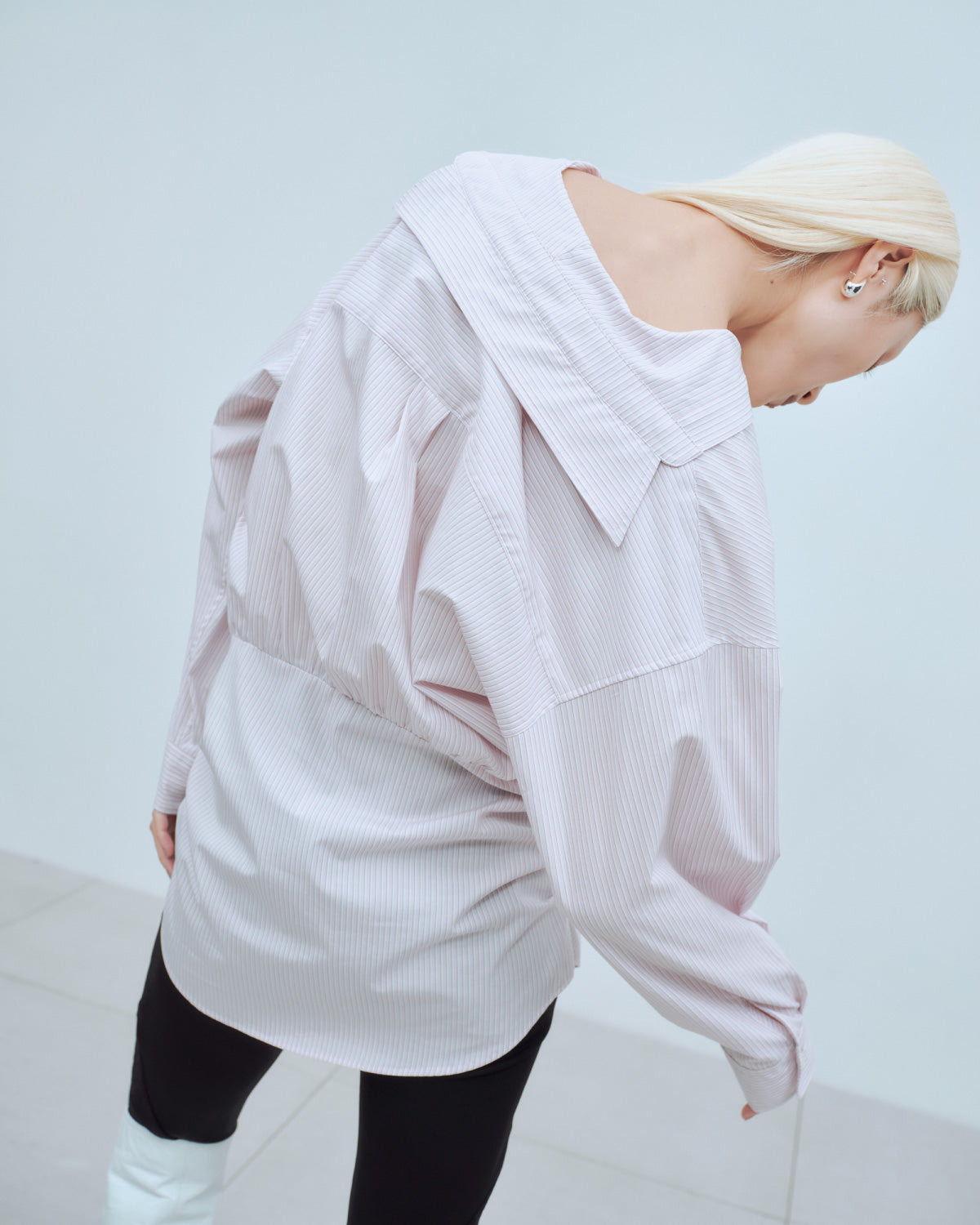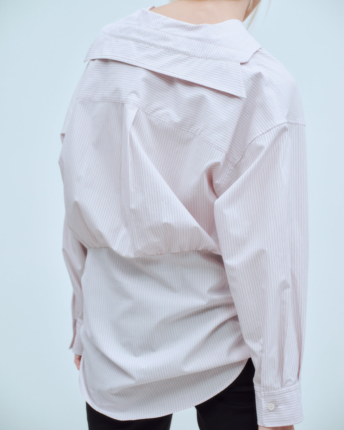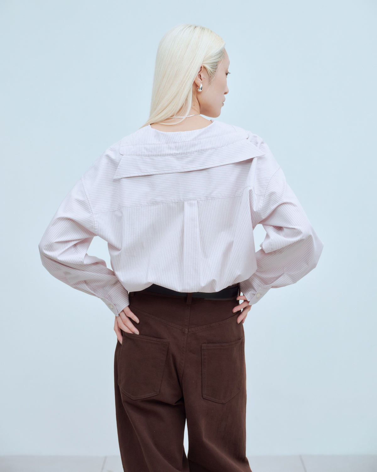 セーラーカラーにも見える抜け衿がポイントの、軽やかなシャツ。裾はお尻まわりを程よく隠すデザインで、羽織としてもインナーとしても幅広く活躍します。