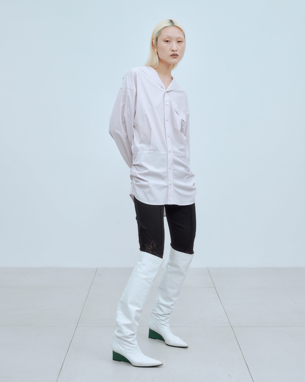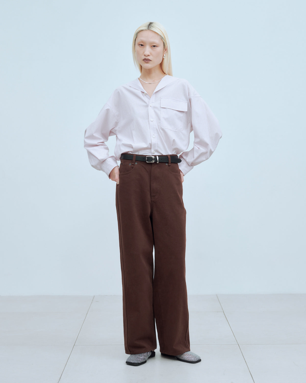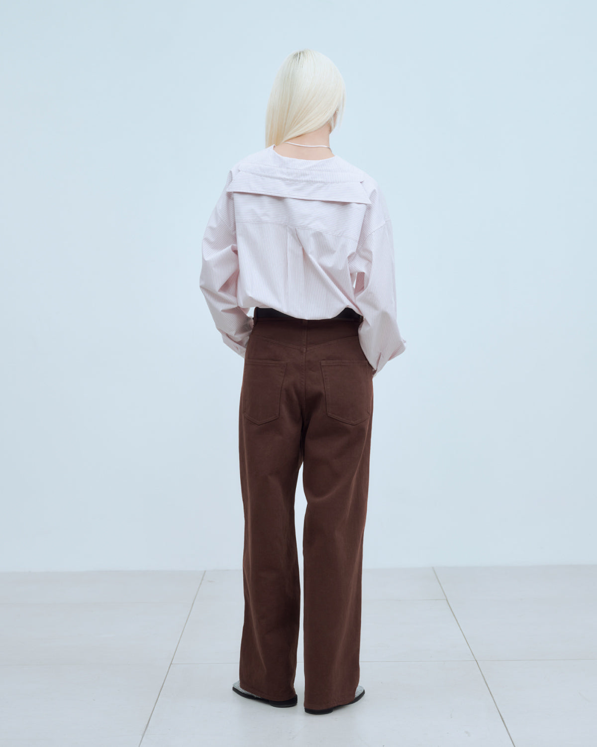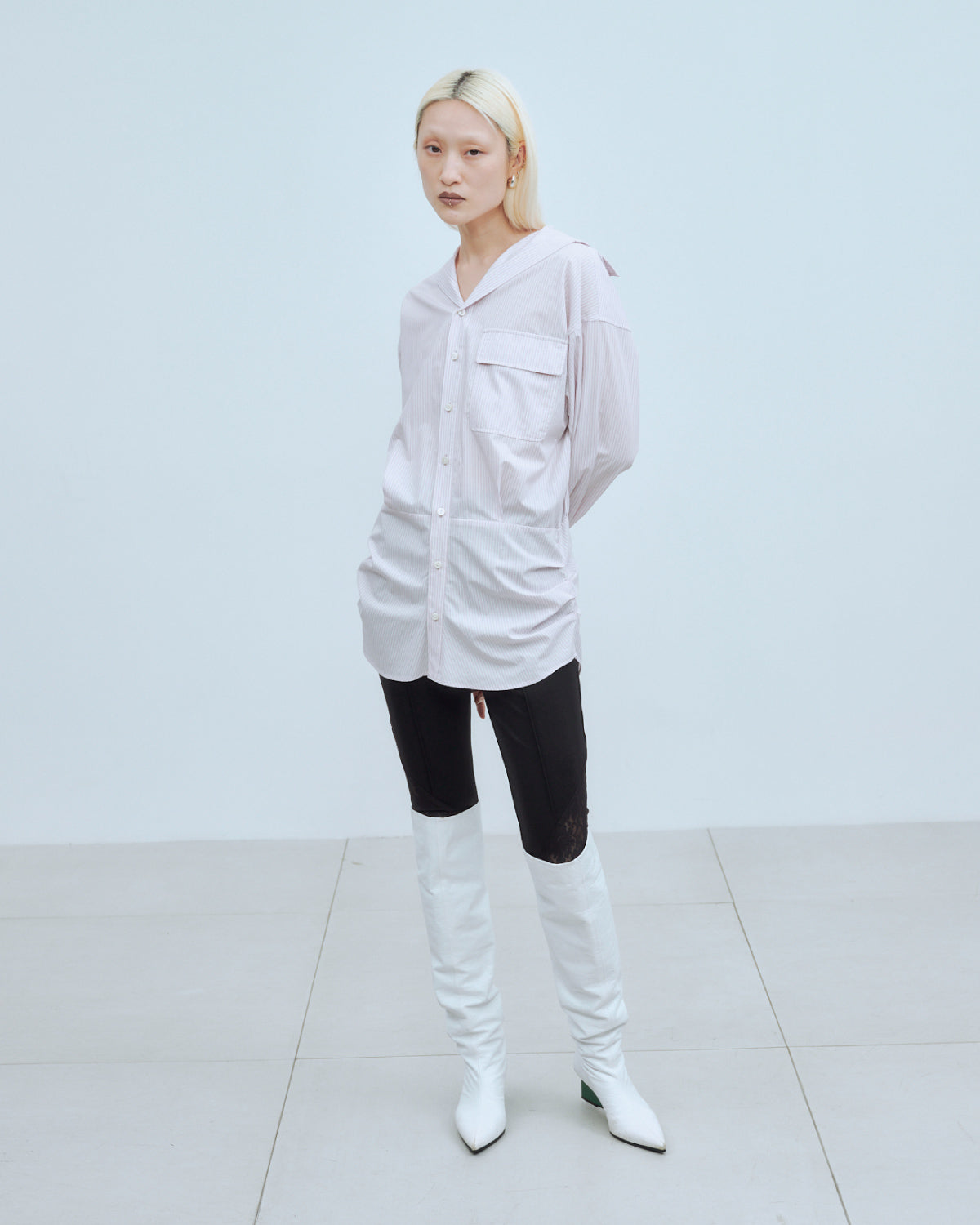 セーラーカラーにも見える抜け衿がポイントの、軽やかなシャツ。裾はお尻まわりを程よく隠すデザインで、羽織としてもインナーとしても幅広く活躍します。