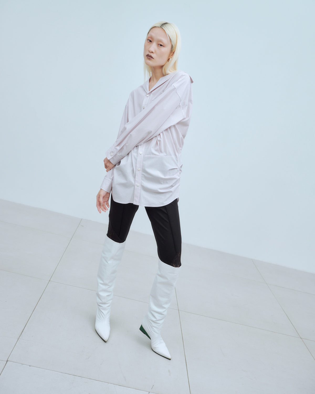 ストライプの春らしい色展開で涼しげな印象に仕上げました。ボトムにインして着ると、ブラウジングが程よく出るような仕様になっており、腰履きでも可愛いシルエットに。