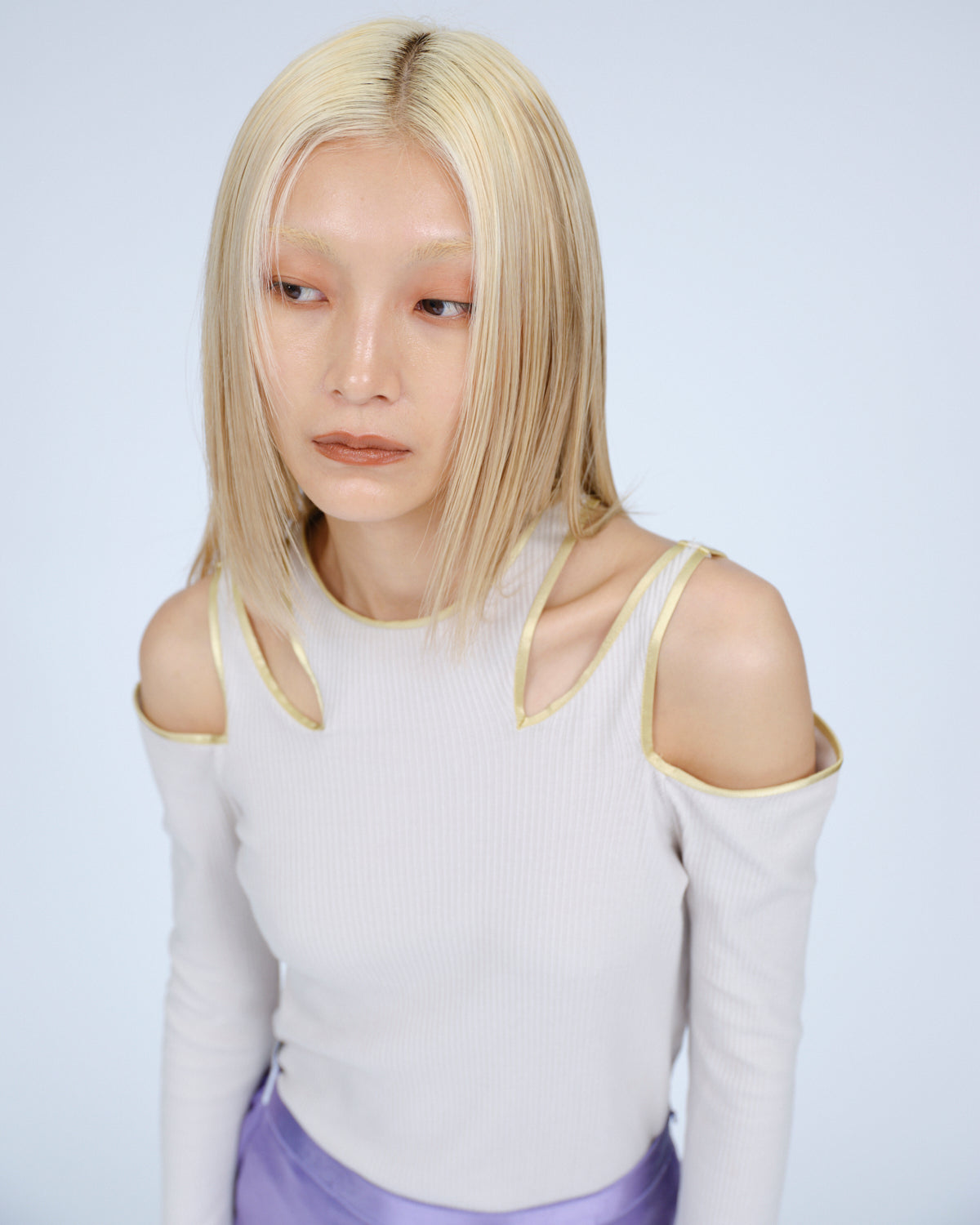 肩に大胆なカッティングを施したランダムピッチのベアテレコのカットソー。